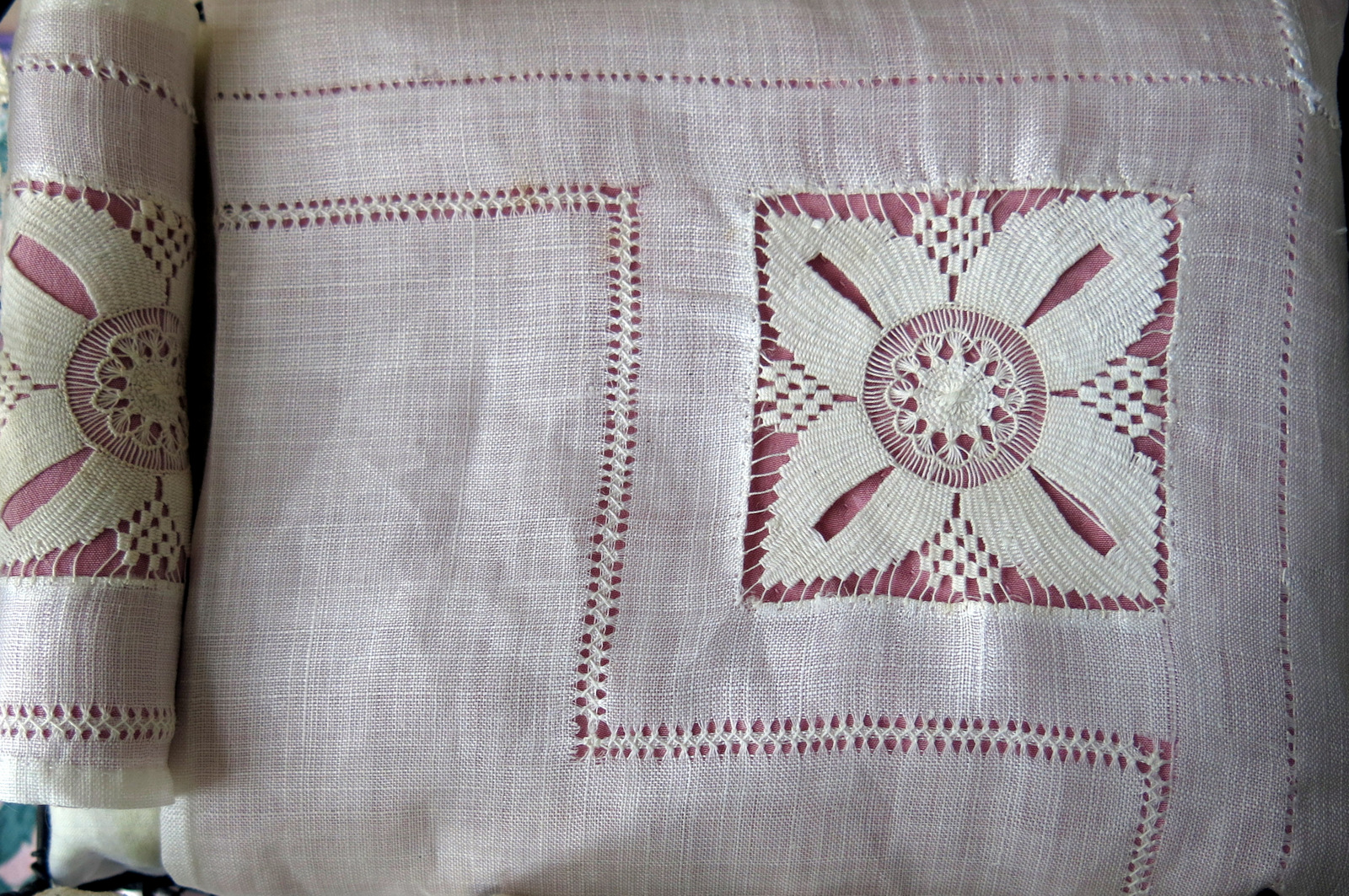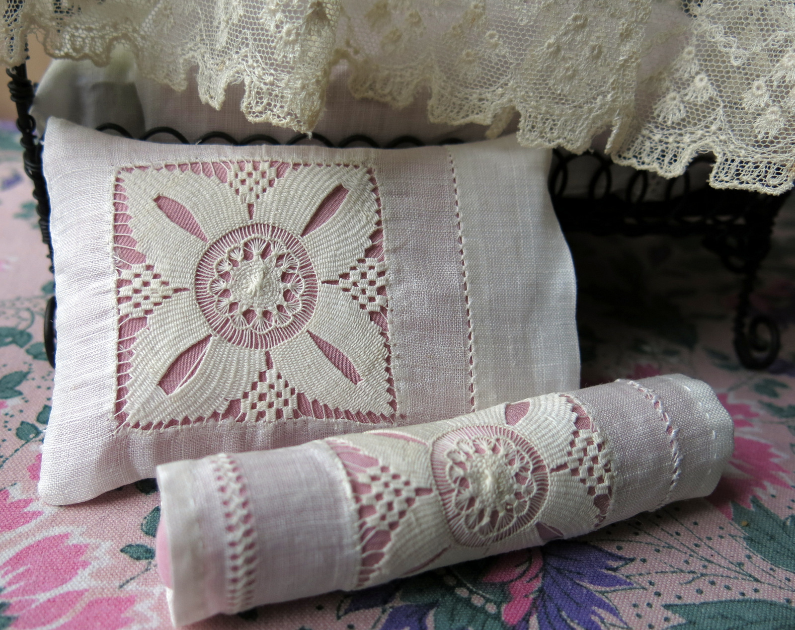 A pretty linen tray cloth was mercilessly unpicked and re-stitched into Hitty-sized Bed-linens…