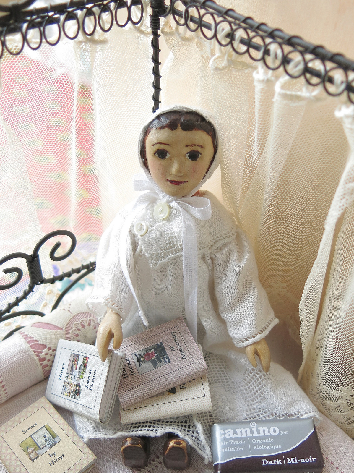 • Constance is glad you think so… the bed was given to Rose and Constance, and she is just delighted that everything worked out so well. The plan is that all the Quimper Hittys will take a turn sleeping in the bed, and guests will also get to sleep in it…I may have to start making elegant nighties for them all though so they can feel worthy of the bed finery!