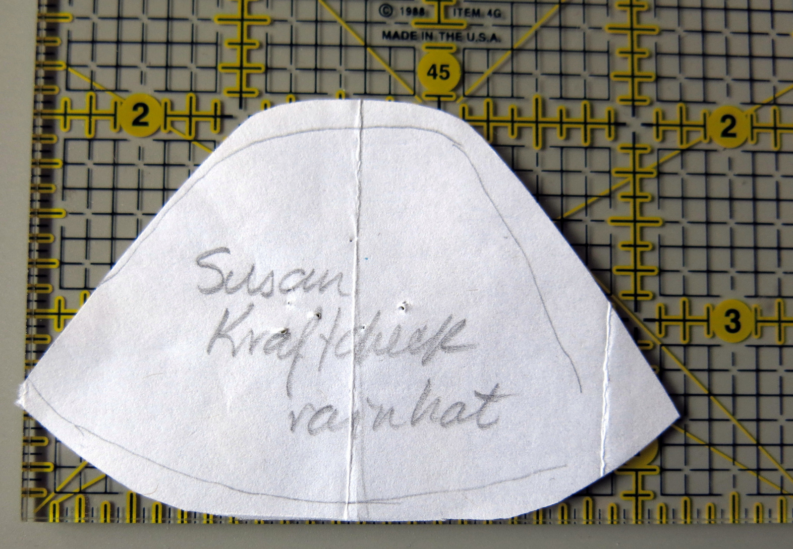A few Hitty friends wanted to know how I made Agathe’s new summer hat so here is an explanation: I made a pattern from a rainhat that I received from a Hitty friend, who has given me permission to share the pattern and the process.