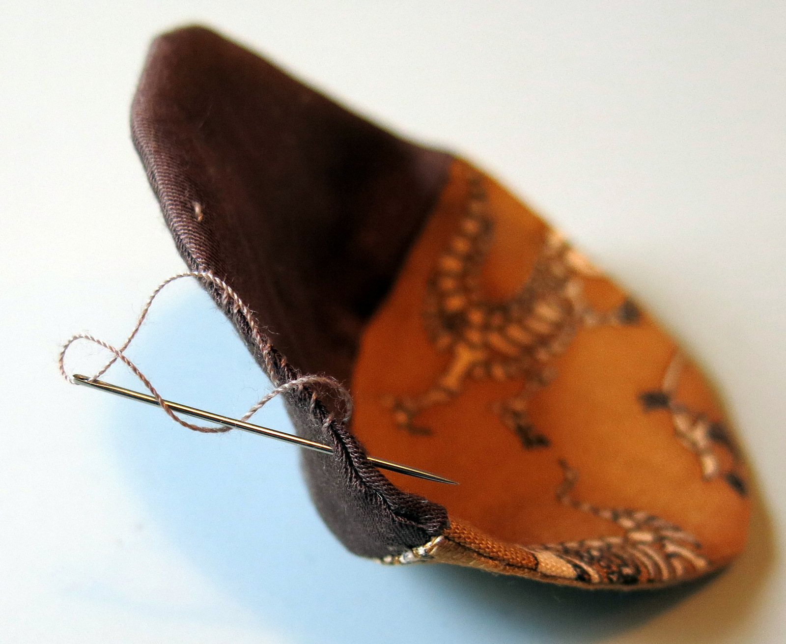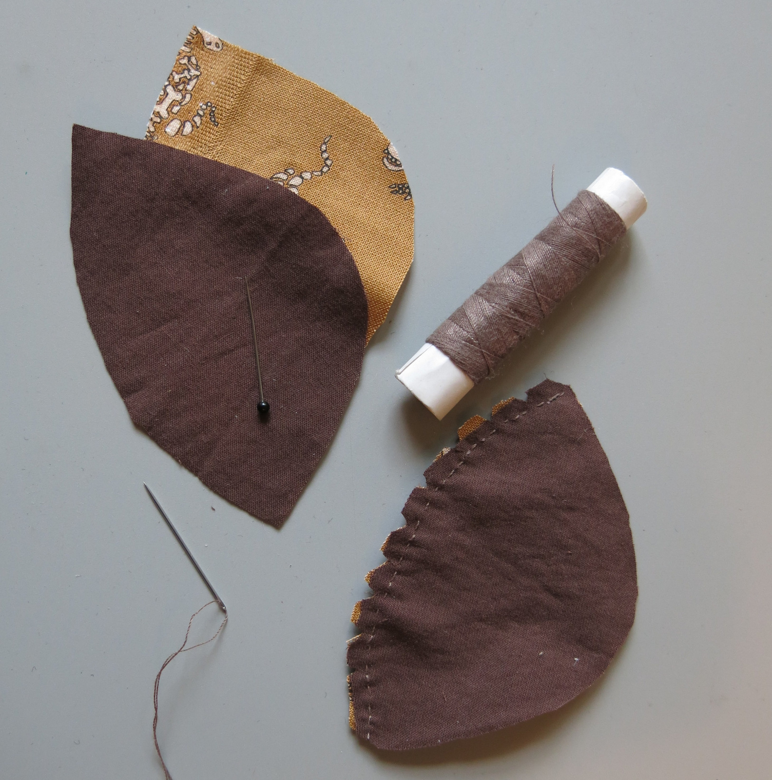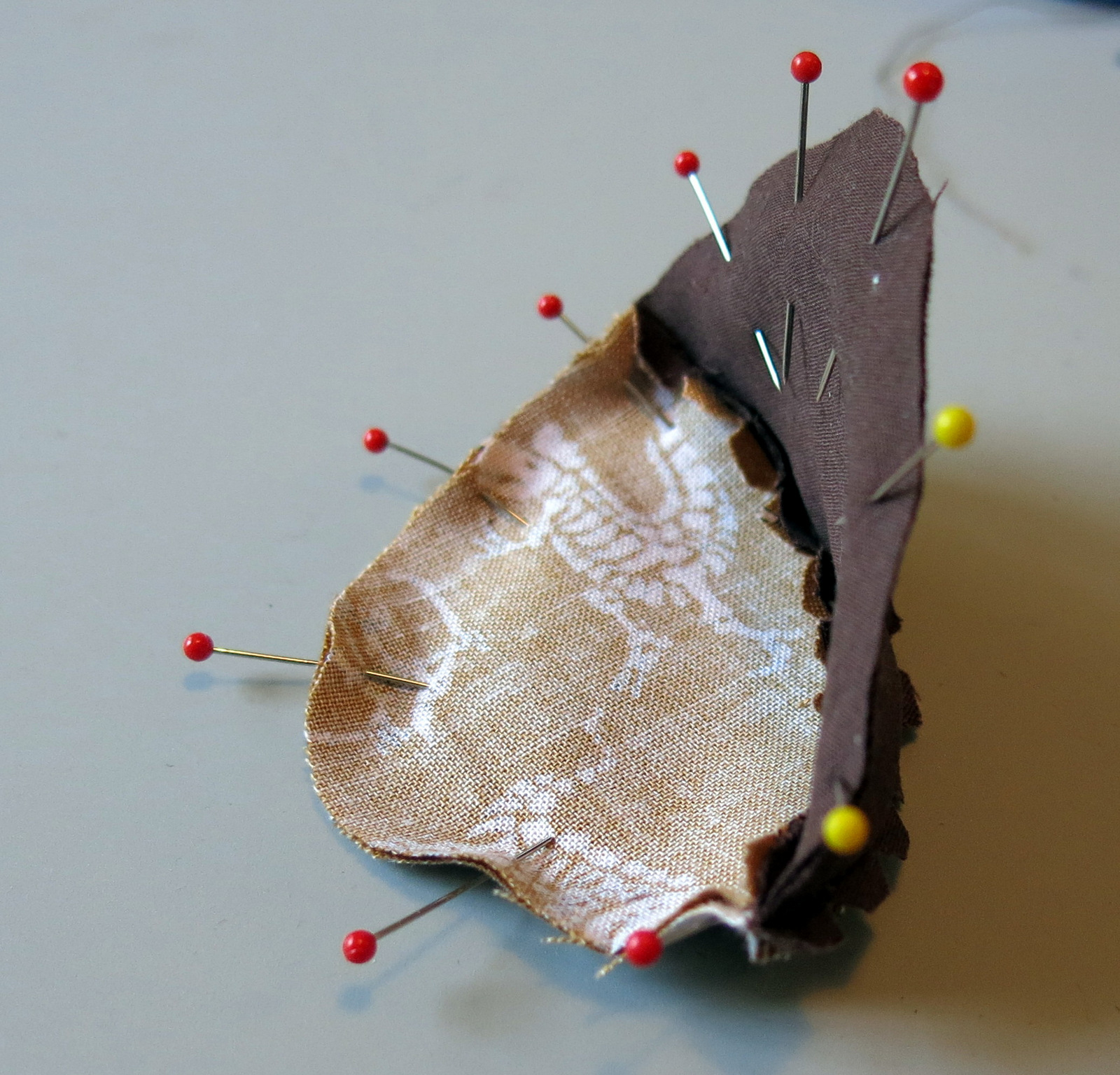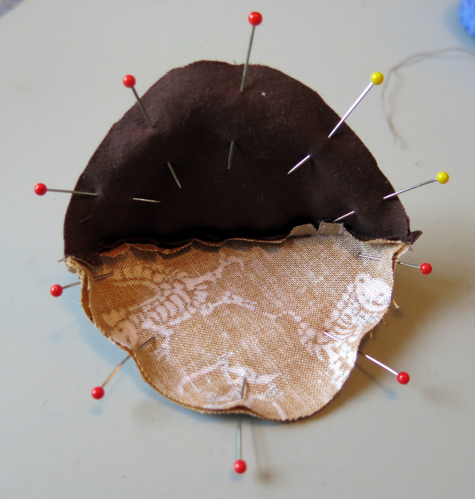 Now put the two together with the right sides of the main fabric in contact with each other, and the right sides of the lining fabric together. Think of the pieces as making up the shape of a ball. If you imagine the ball is squashed, then one side is convex along the fabric/lining seam and one side is concave. Make sure the right sides are together! Match the seams carefully, and pin.