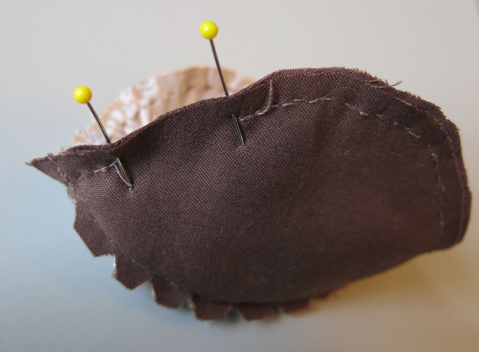Here you can see you are going to stitch all round the circumference, leaving a space open to turn it right side out. I’ve marked that space between the two yellow pins.