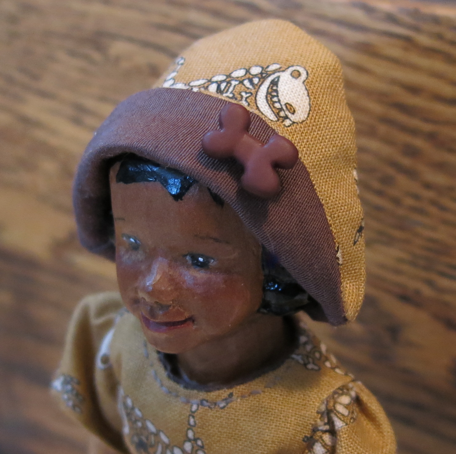 We’re lucky in our fabric-hunting, and people give us nice scraps too. The dinosaur bones fabric came to us from a Hitty friend who thought that the Quimper Hittys would like some Museum-y clothes!