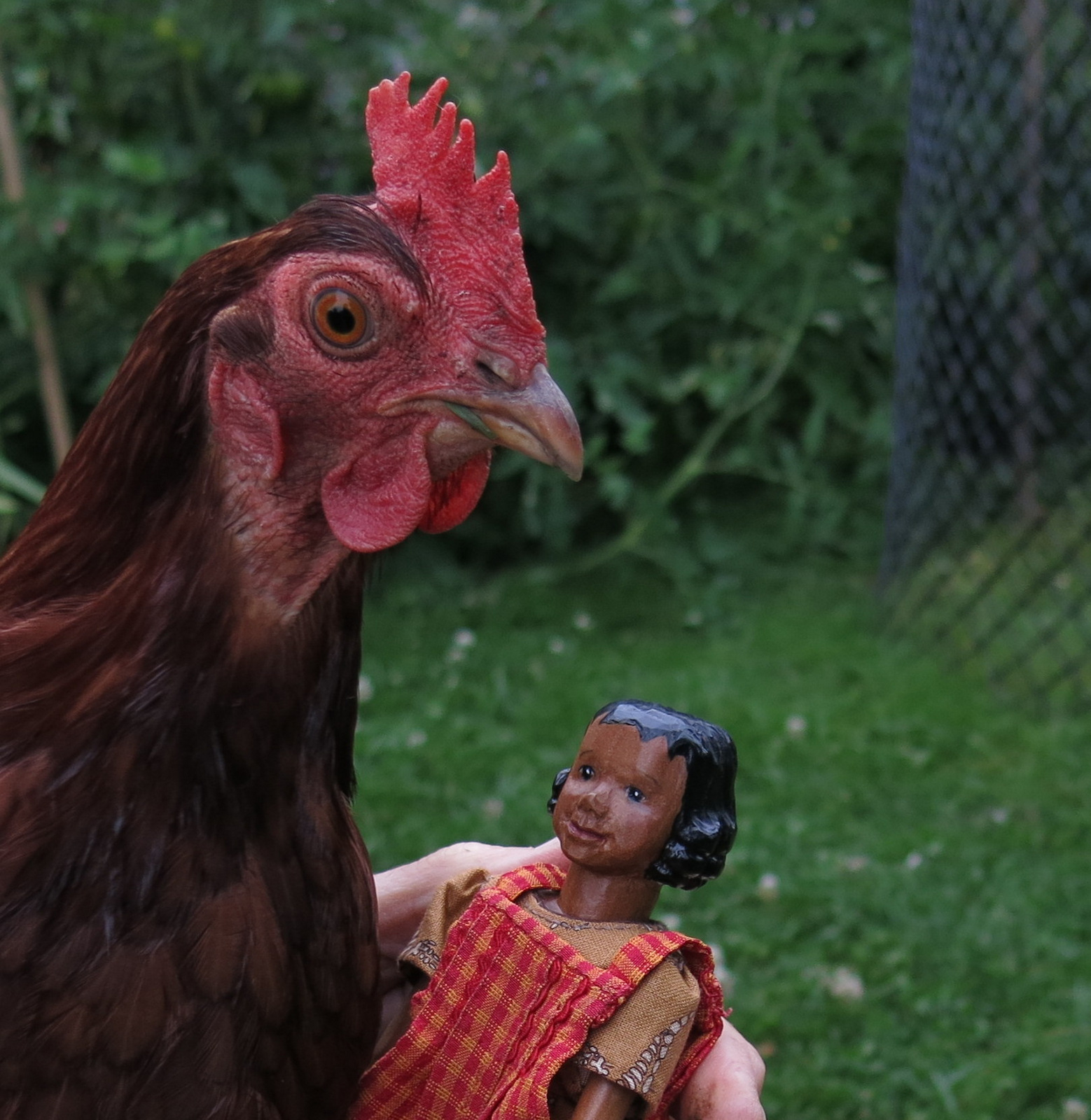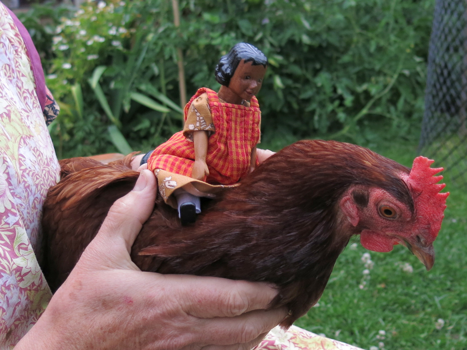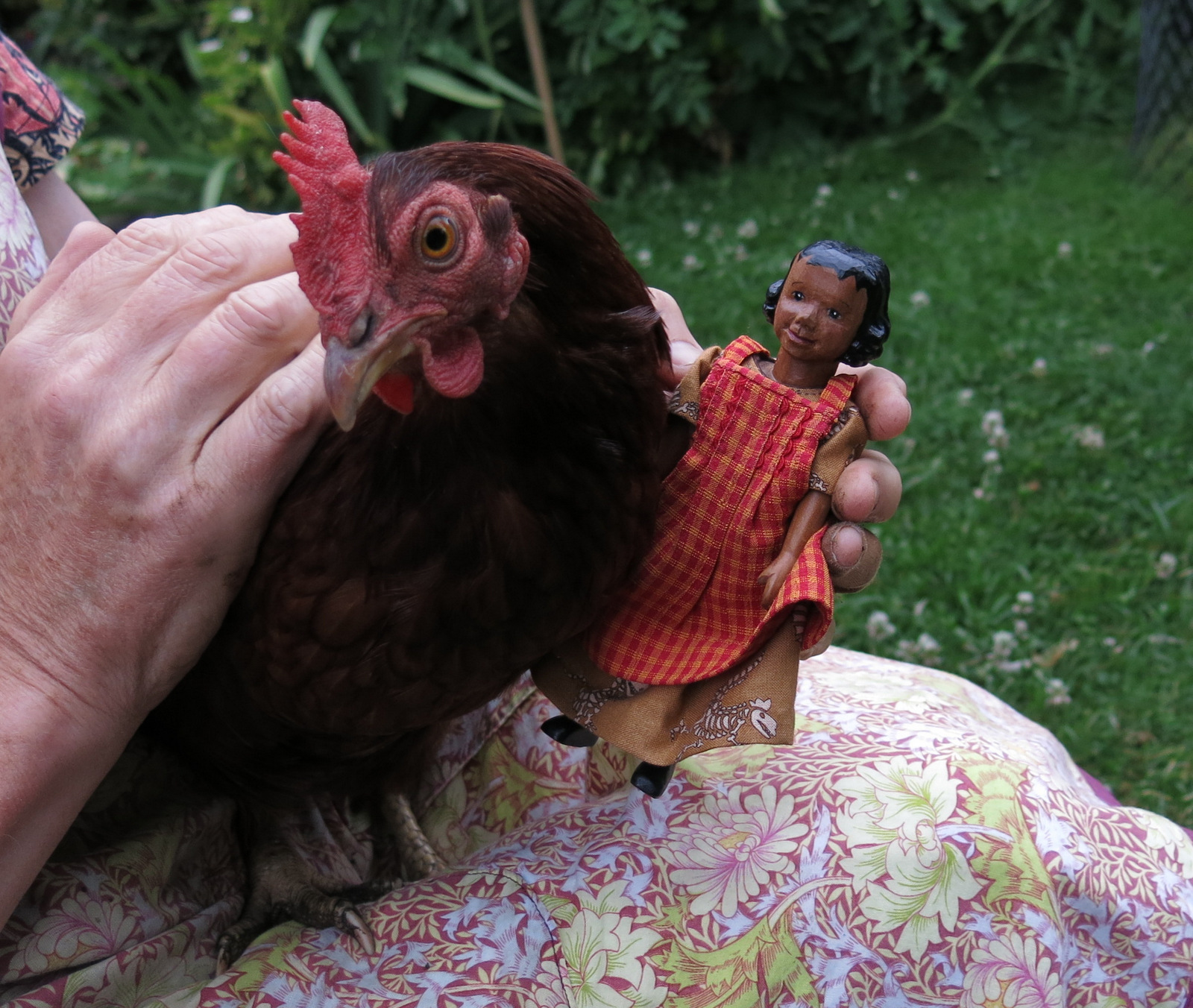 Agathe was invited to visit the home of a friend who keeps hens…the Orpingtons are busy looking after chicks but the Rhode Island Reds are enthusiastic layers.  My friend thought Agathe and Agatha the hen might like to meet each other, and while Agathe was enthusiastic about it, the hen was not….