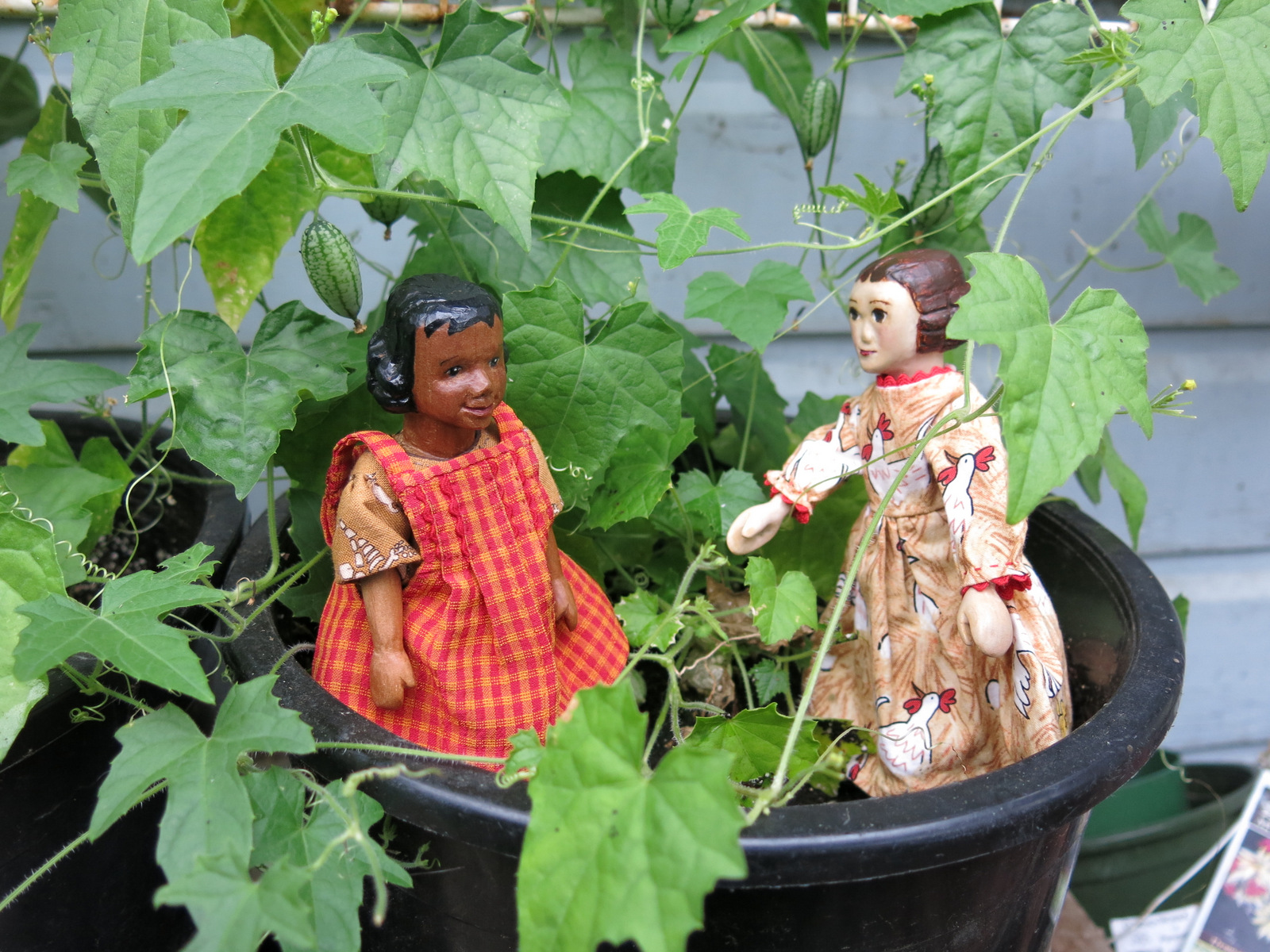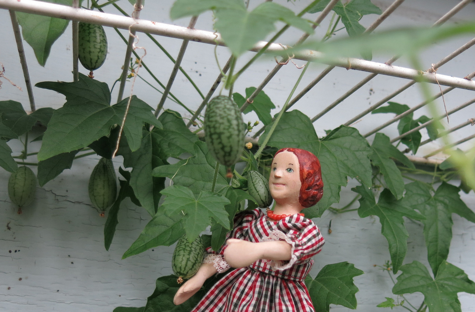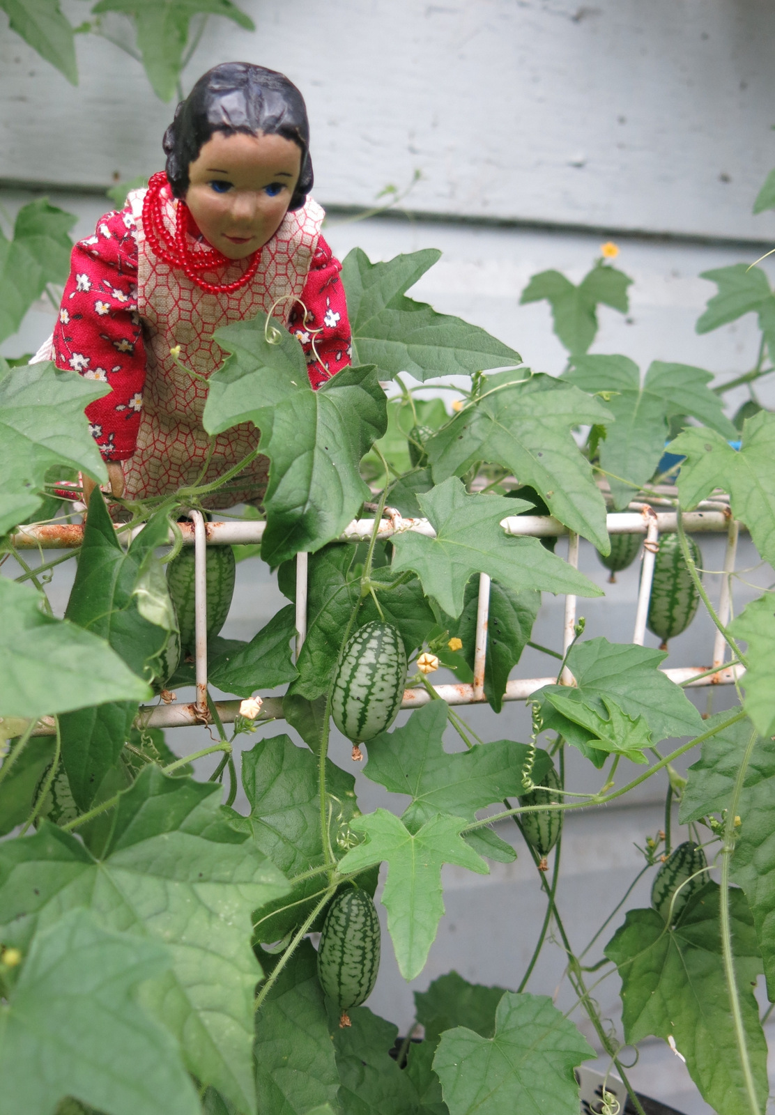 The girls picked a little bowl full of Mouse Melons, and will invite their sisters to share the bounty!  These are a little bitter cucumber Melothria scabra, native to Central America.  Click here for more information about Mouse Melons. Don’t they look like Hitty Watermelons?  Even though they are green inside, not pink  we think every Hitty Household should grow them!