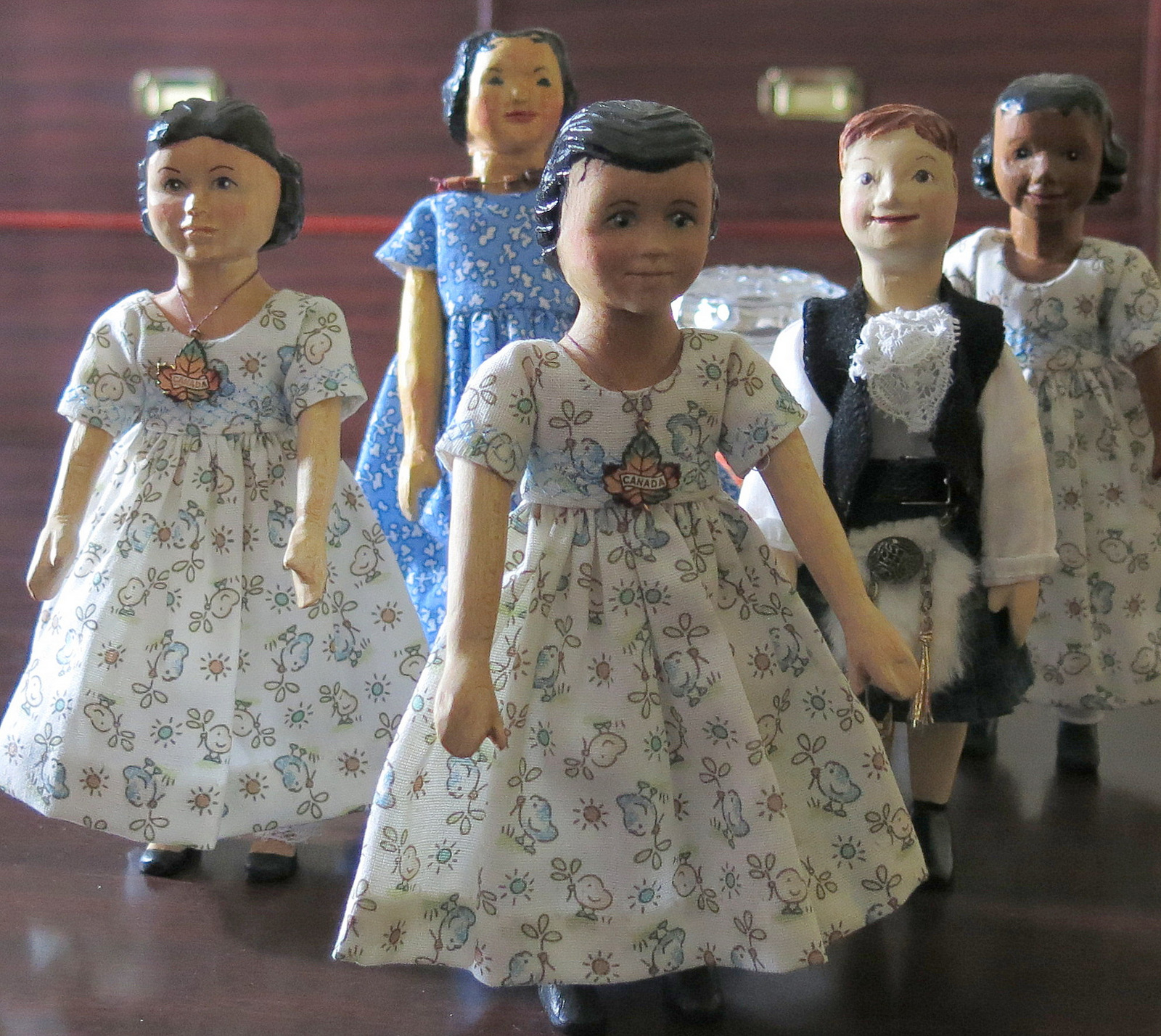 The Quimper Hittys entertained foreign visitors last weekend! Here are the visitors – Sequoia Dawn, Hitty Gracious, and  Merrin-Katz, who are posing with the locals – Mungo and Agathe.  Sequoia Dawn and Merrin-Katz are wearing “Canada” necklaces, and pretty matching Birdie dresses.  Out of the kindness of their hearts they brought Agathe a dress too.  Since they were staying at the Royal Scott Hotel, Mungo felt he had to come along and inspect the premises. He gave it the thumbs-up, and then retired to the Hitty basket to escape the Hitty Twittering.