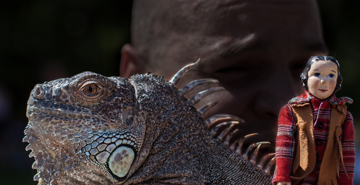 Making friends with iguanas seems a slow business when all they do is blink (rarely) and make imperceptible movements. She probably had as much success with the lizard on the carved skull.