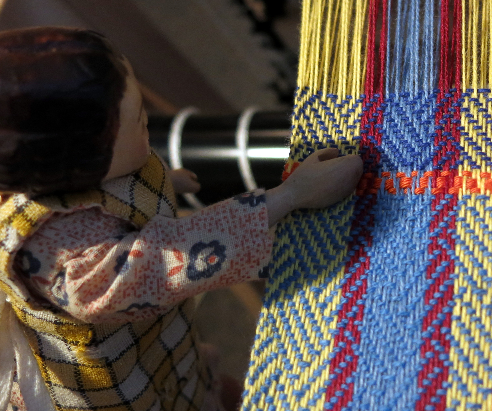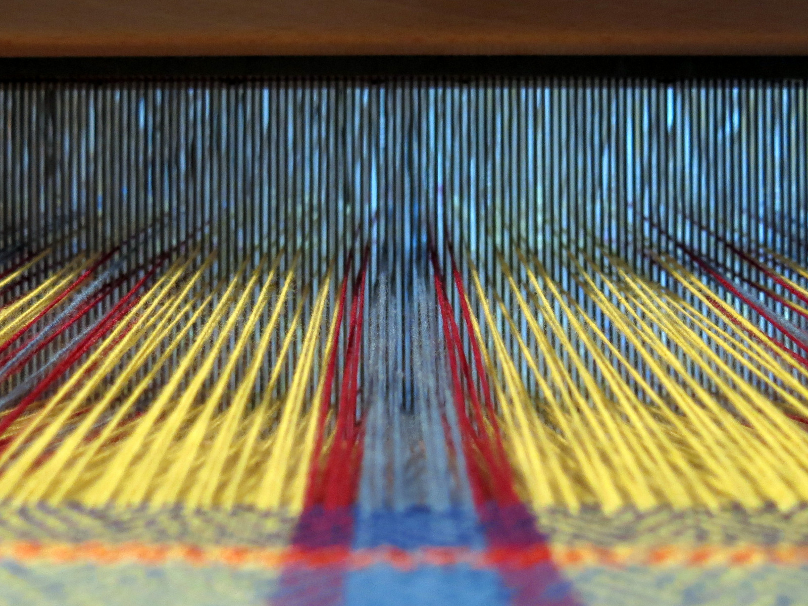 Another morning at the loom, and Constance is as usual ready to help.  We are still working on the plaited twill warp, but instead of an all yellow weft, today we are going for blue …