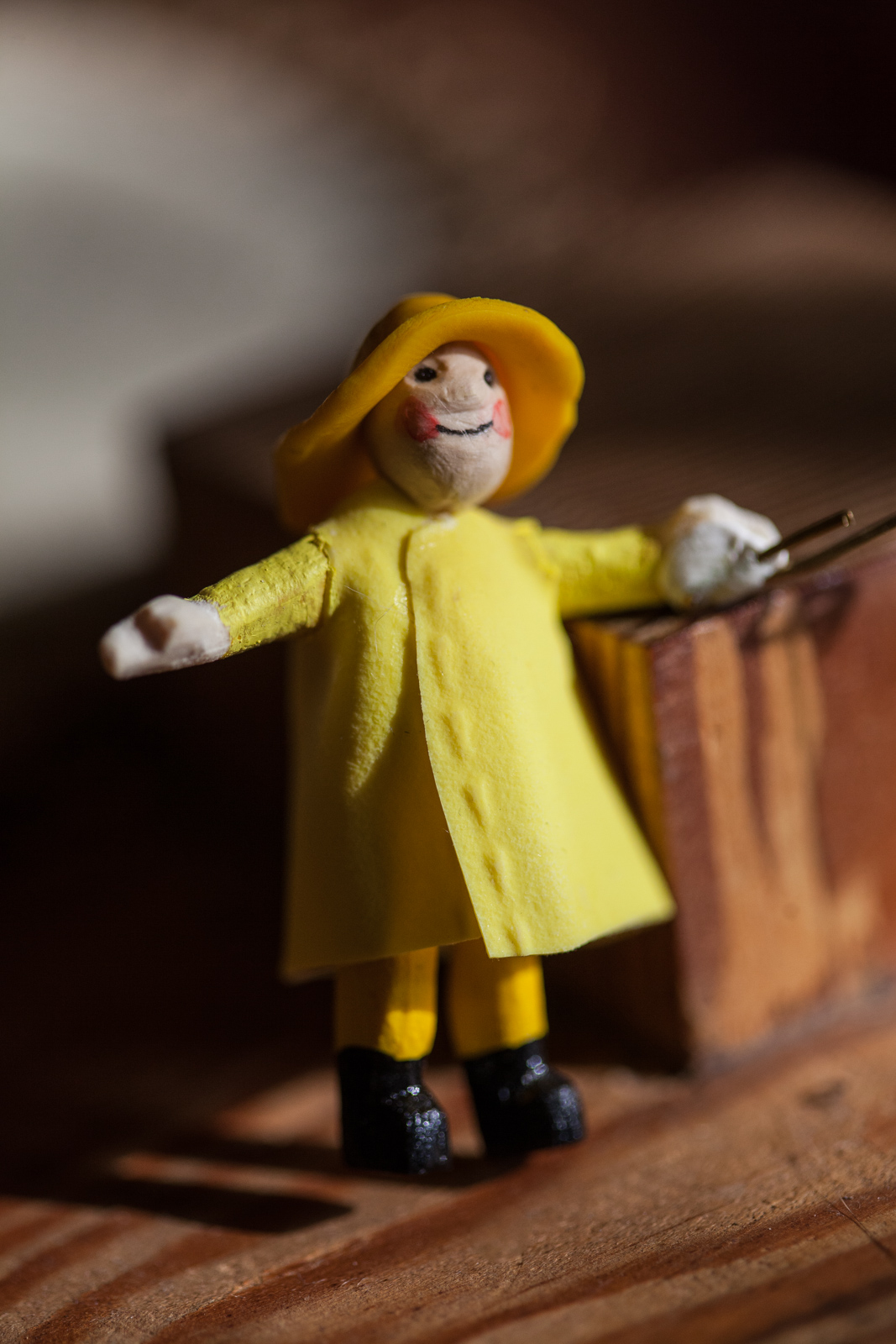 His head is a Cherry Pit; body, arms and legs are carved and painted chopsticks; he sports a sou’wester made of Fimo; and his slicker was a rubber glove fingertip…