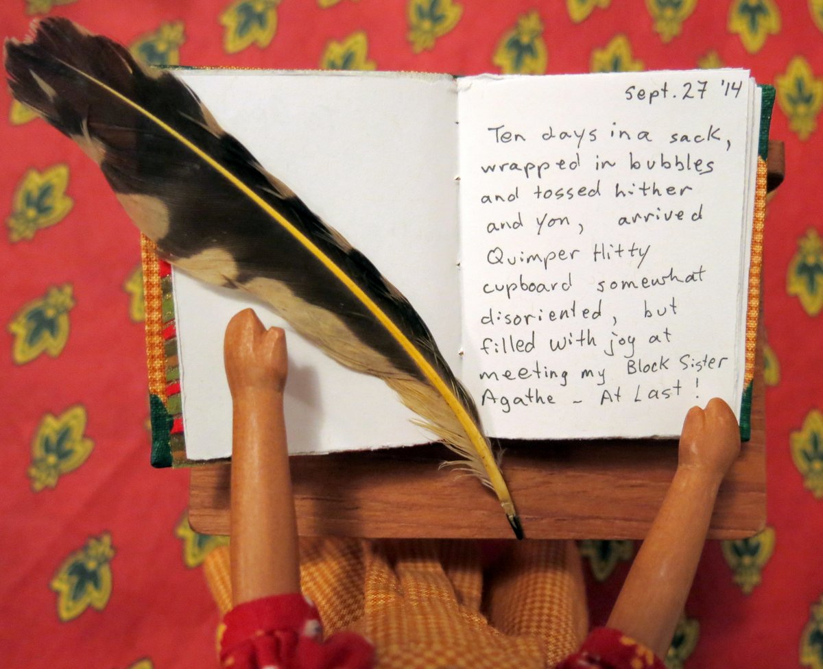 During their recent marsh meanderings Opal and Agathe found a beautiful feather, shed by a yellow-shafted Flicker…this inspired the Quimper Hitty’s human to create a special gift for Opal, with the feather playing an important ancillary rôle .