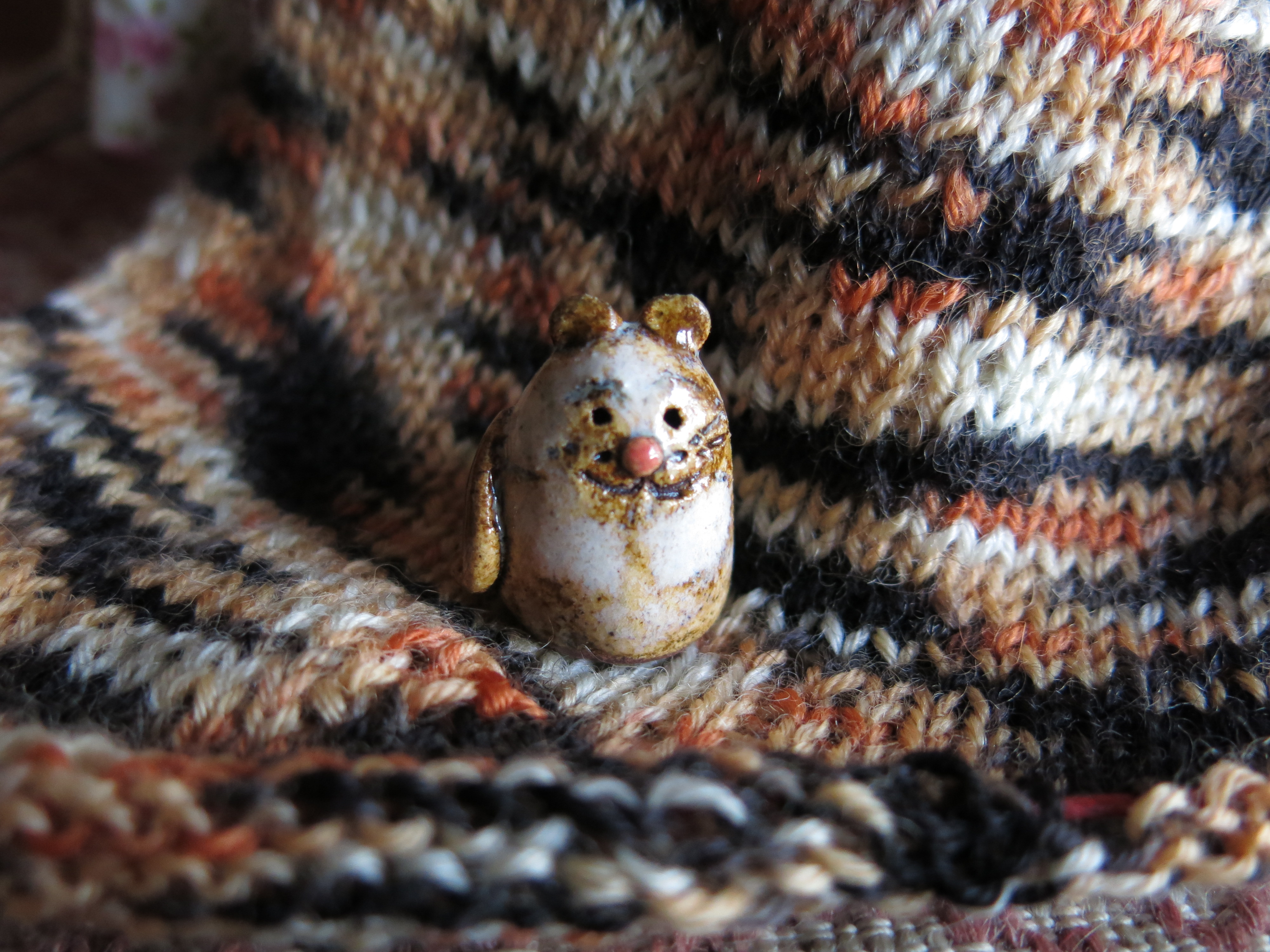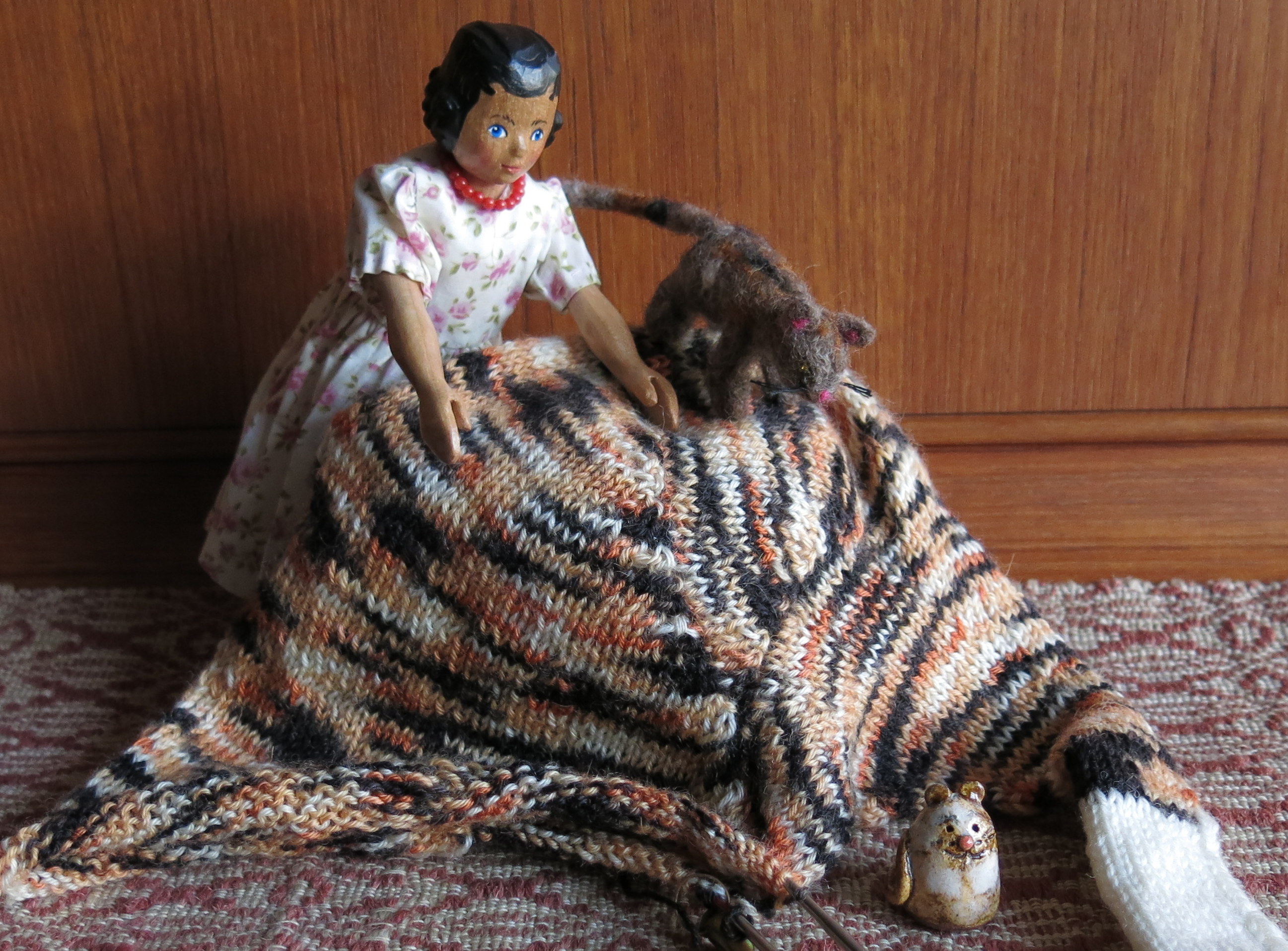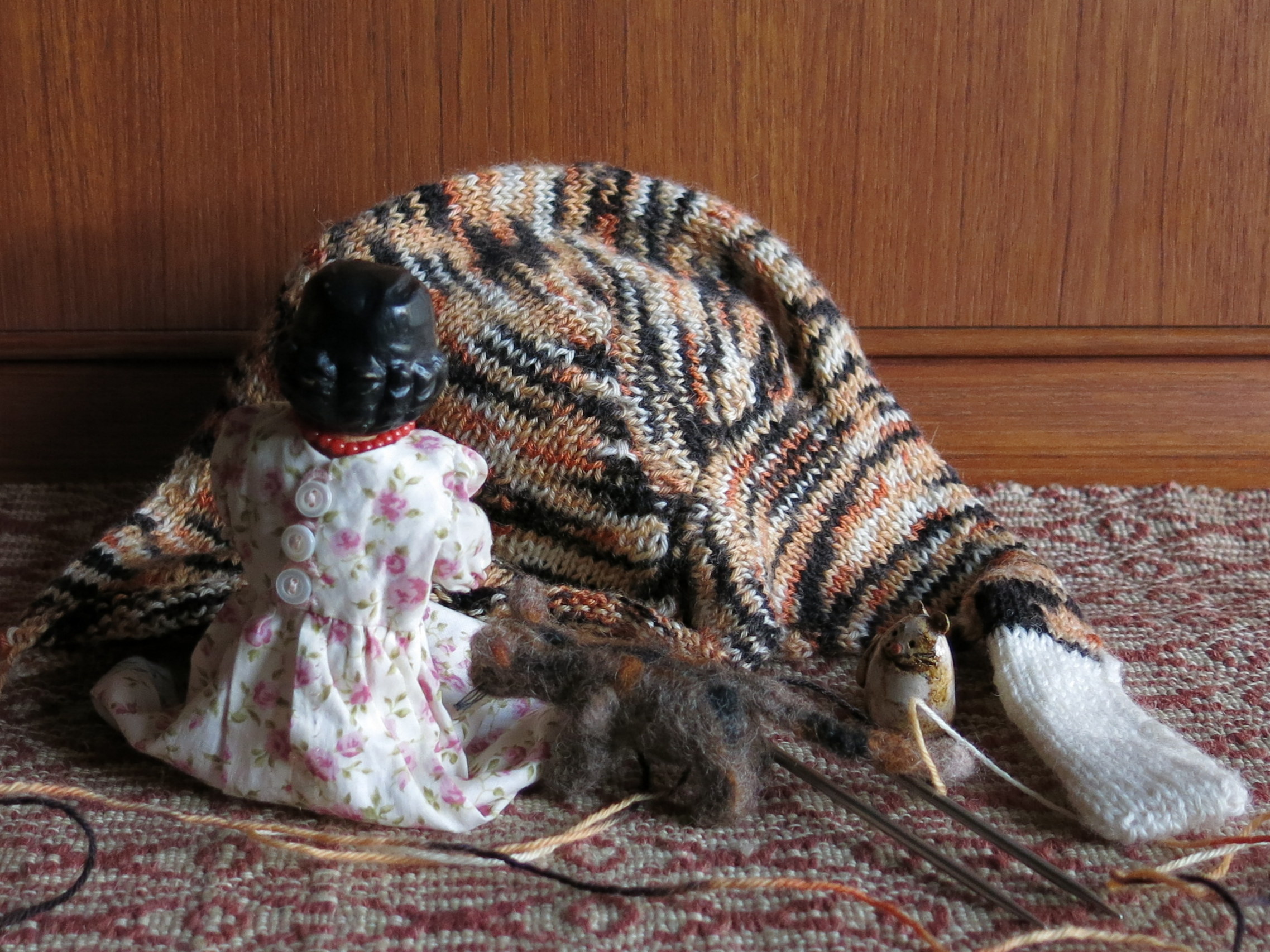 She and the Quimper Hitty Human’s relation are invaluable encouragers as the human gets lost in the pattern, unpicks short and long rows, despairs at mysterious lumps and teeters on the edge of resignation. The examples of quiet Rose and the enthusiastic relation are the only thing that keeps me going some days! And of course there is always cat therapy to restore my equilibrium…