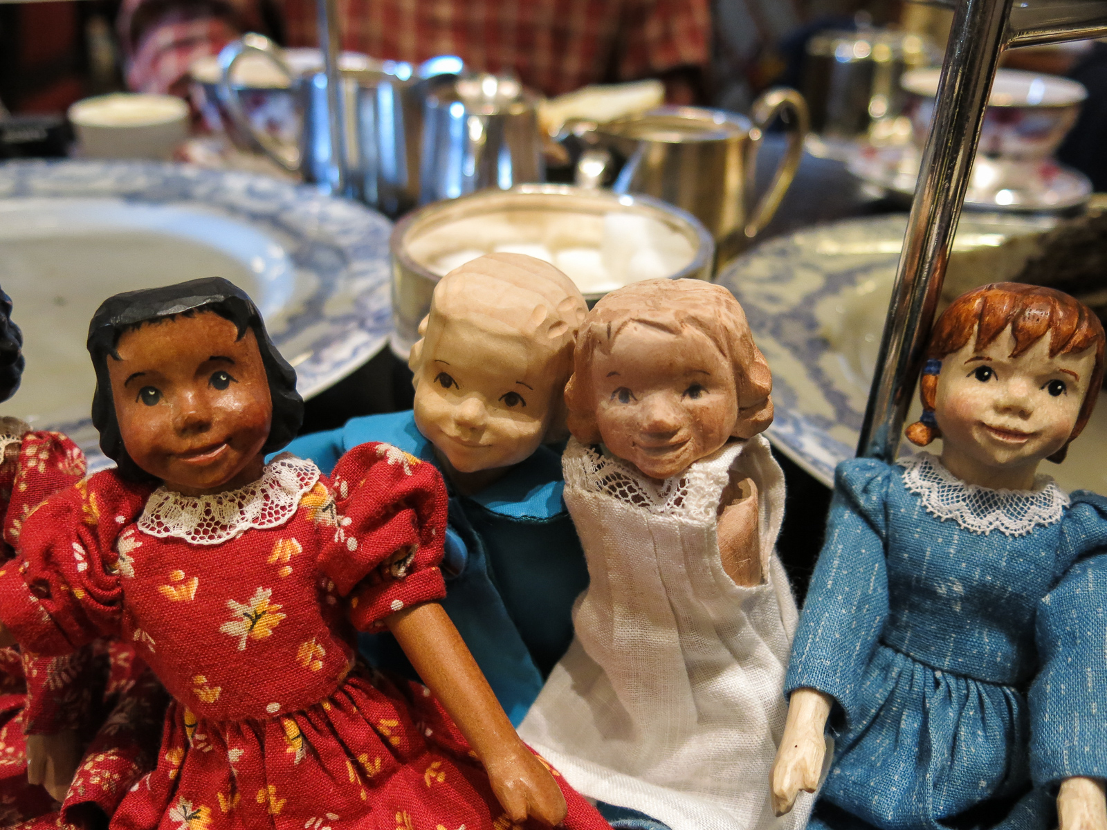 That’s probably true – there were many tables full of tea-drinkers, but none of the others had little wooden people diving into whipped cream, divvying up desserts, wrestling with pots of jam and playing with the sugar tongs!