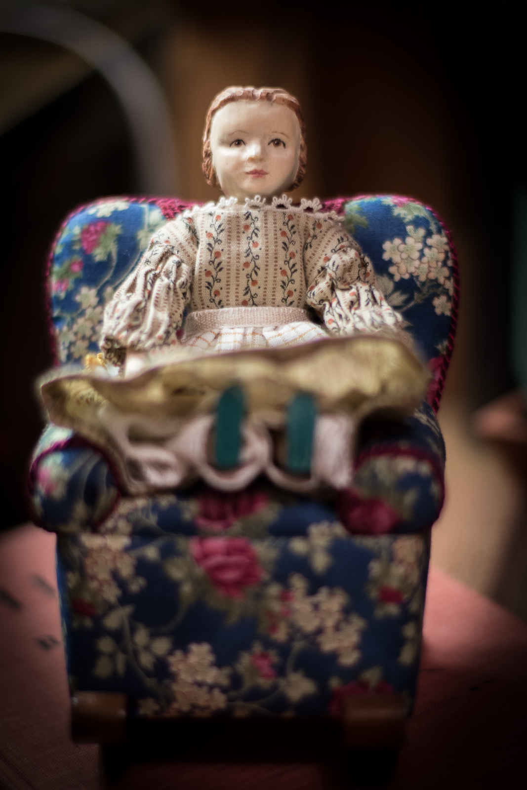 I got the chair at a thrift shop, it was supposed to be a pincushion, and has a lifting-up seat for Zipporah to hide her novels in when she really ought to be doing the mending!