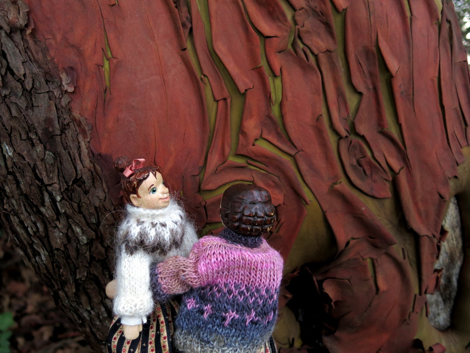 During a December afternoon stroll around our neighbourhood, Constance and Min became interested in the varieties of tree bark. Here Constance is demonstrating how the Arbutus tree bark peels and drops off…