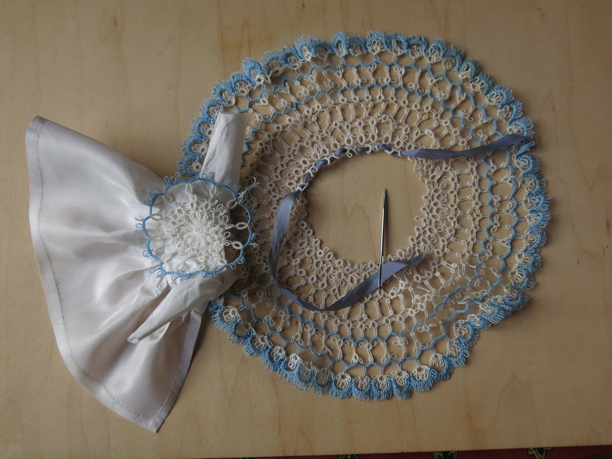 A little white taffeta dress sewn, and the doily’s middle snipped out…With greyish blue silk ribbon threaded into the loops the rest becomes an instant overskirt!