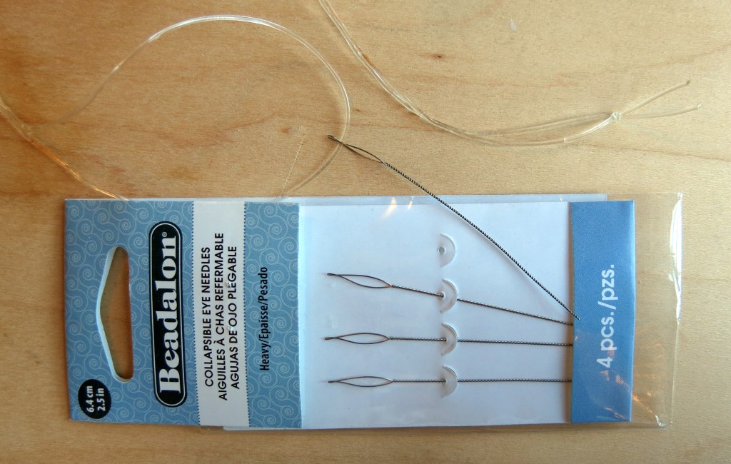 I’ve cut a length of 1 mm stretchy beading cord, threaded it onto a collapsing eye needle, and tied a knot at the end of the doubled cord.