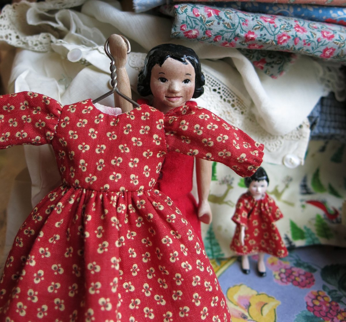 • I think red is Carline’s colour alright! I am happy to share her, she is a little scrap of goodwill. Along with Tatty she will, no doubt, keep things hopping in the Hitty cupboard. I pick up tips here and there – sometimes they work for me and sometimes not…it is hard sewing at this scale, so if I find something that works, I am happy to pass it on!