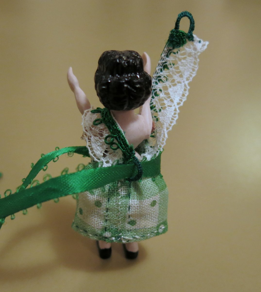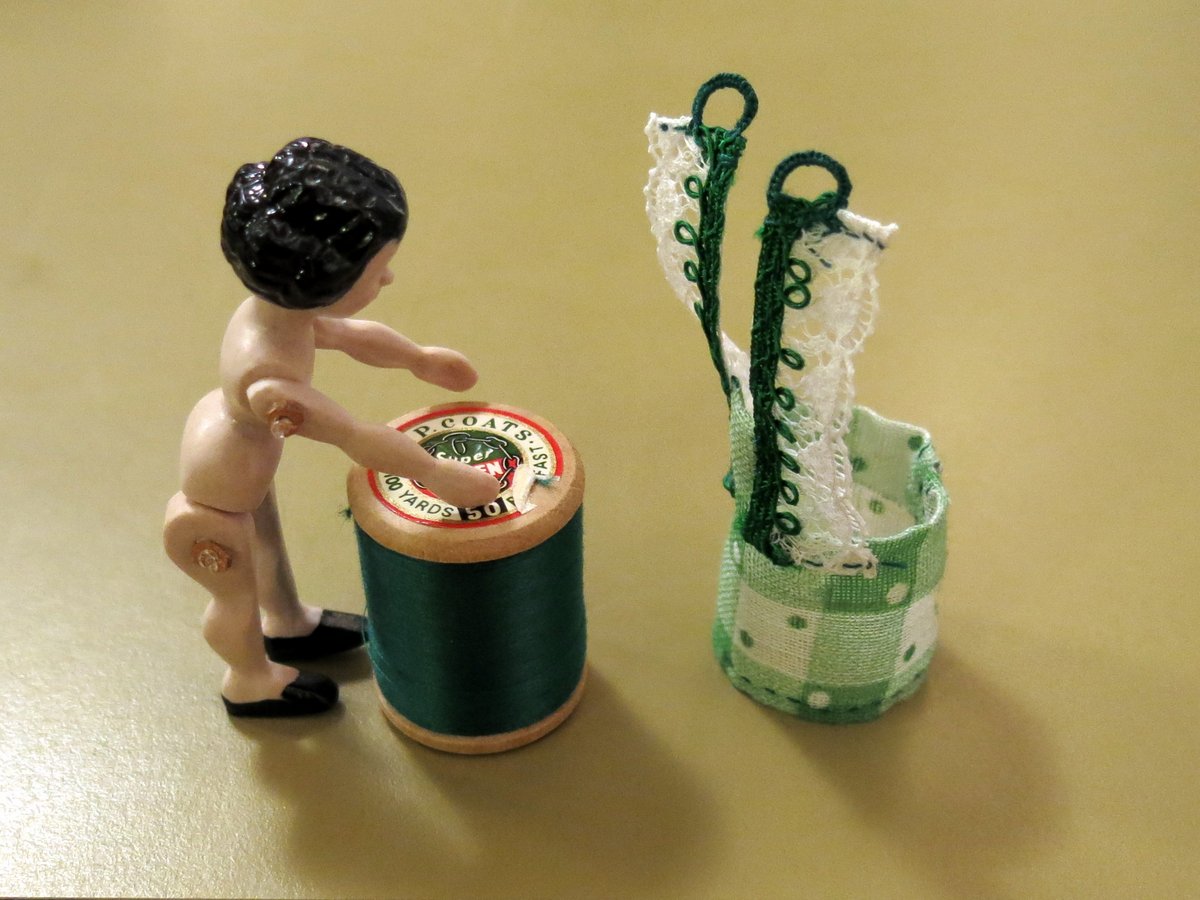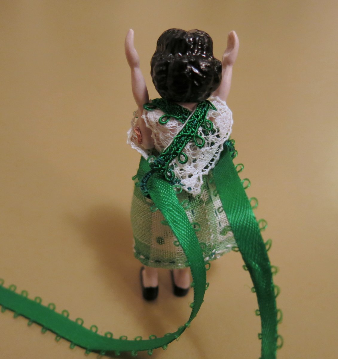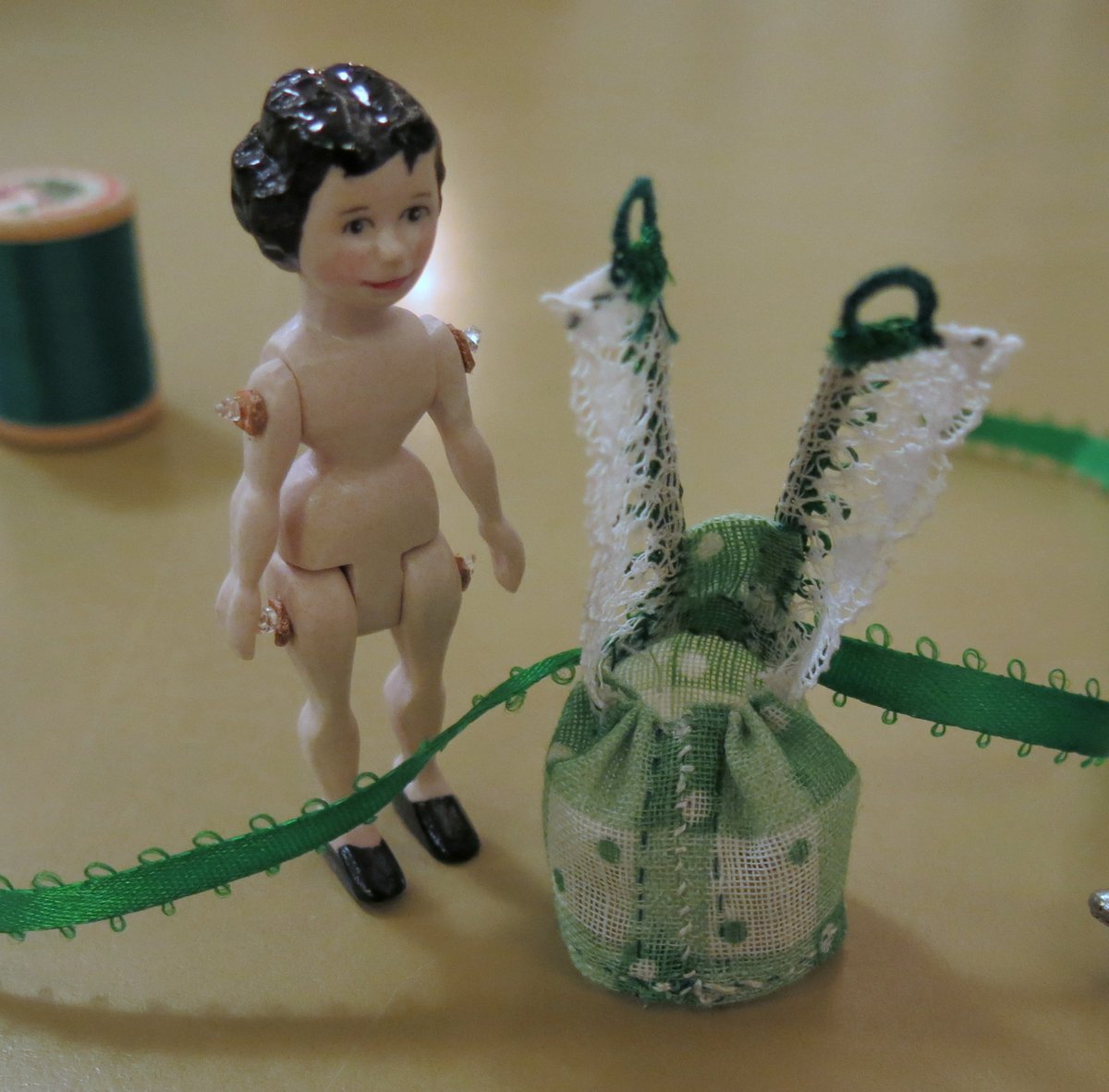 Stitch a narrow ribbon onto some narrow lace. Make each strap about two inches long.  Stitch one of each assemblage to the sides of the bib and tack the lace to the waist.  Try it on the doll to confirm the length (read to the end of this post to see how long it should be). Then trim the length if needed, fold and hem the ends. Work a button loop at the far end of each lace/ribbon assemblage. Hem the bottom of the skirt.  I have also hemmed the centre backs because it was a very shreddy material.