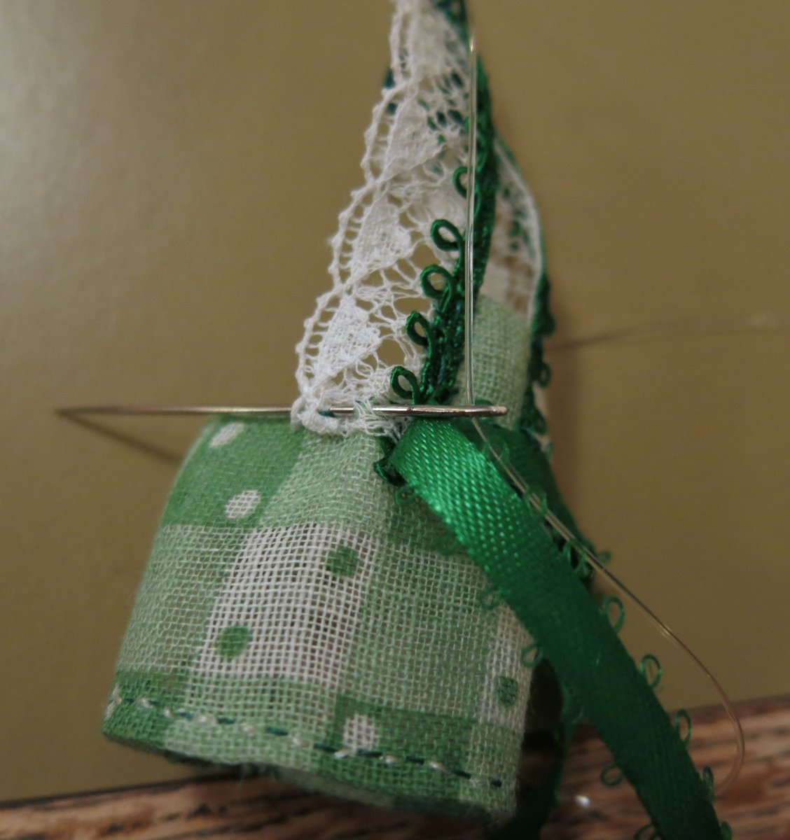 Knot some thin elastic cord, hide the knot under the waist ribbon and gather the back waist…secure the other end with a French knot under the ribbon at the other side, and cut off the excess.