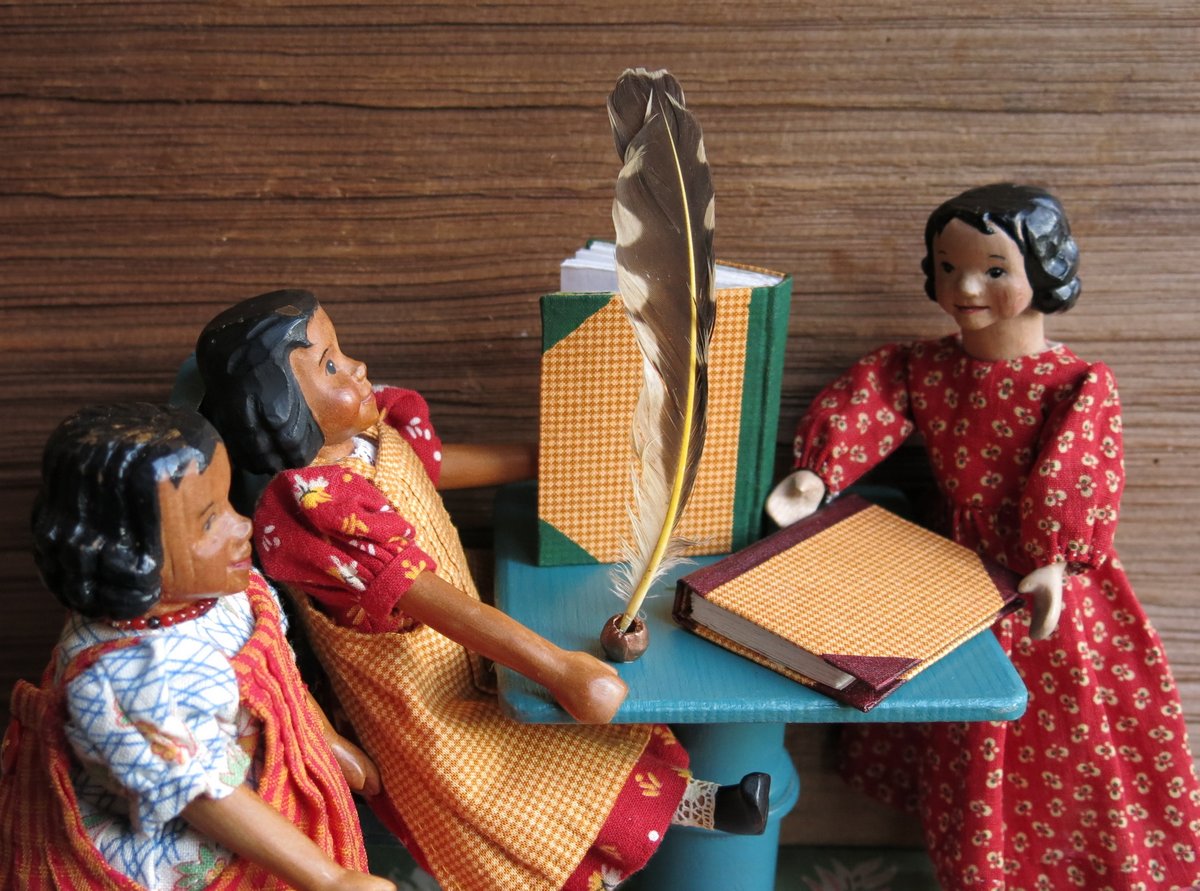 • I made the second Journal soon after the first one, I predict that I will need to make another one before Opal goes home…The chair is one of the few remaining pieces of furniture from my mother’s dollhouse, and I made the table out of spools, and painted it to match!