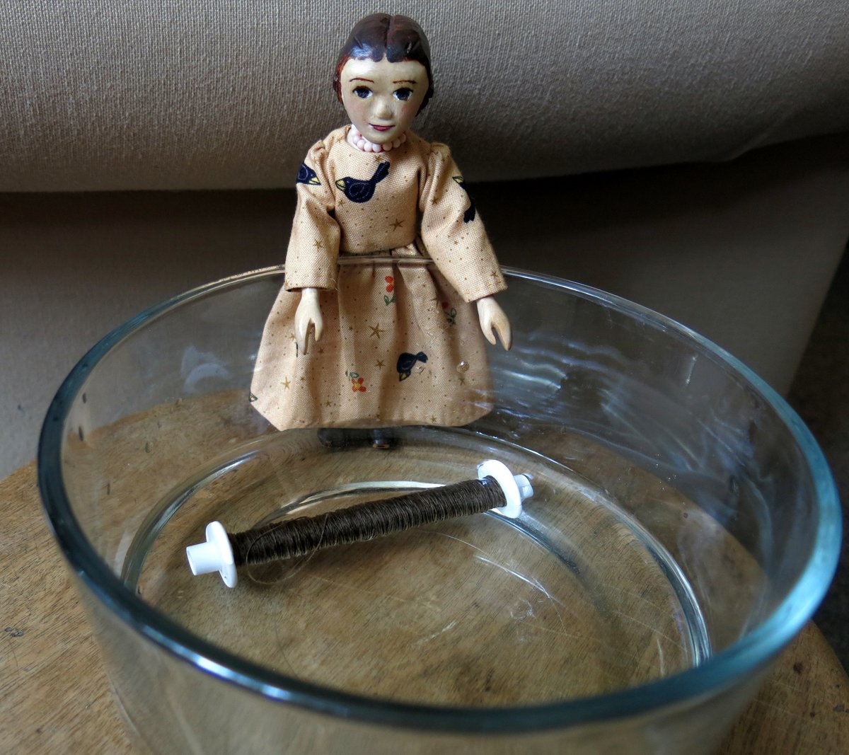 Our linen-weaving project has a couple of new twists to it – our friend is soaking the wound bobbins in water prior to weaving. This is not in honour of the flood – it is meant to make the linen less twisty and more flexible!