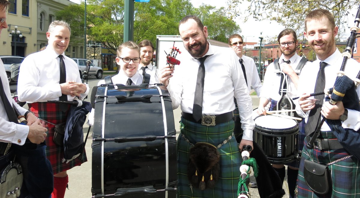 Mungo was happy to meet a whole group of people who actually share his passion for the pipes. The Vancouver Island Caledonia Pipe Band was delighted to pose with him and commiserated about the difficulty in finding a place to practice. Click here for a link to their website.
