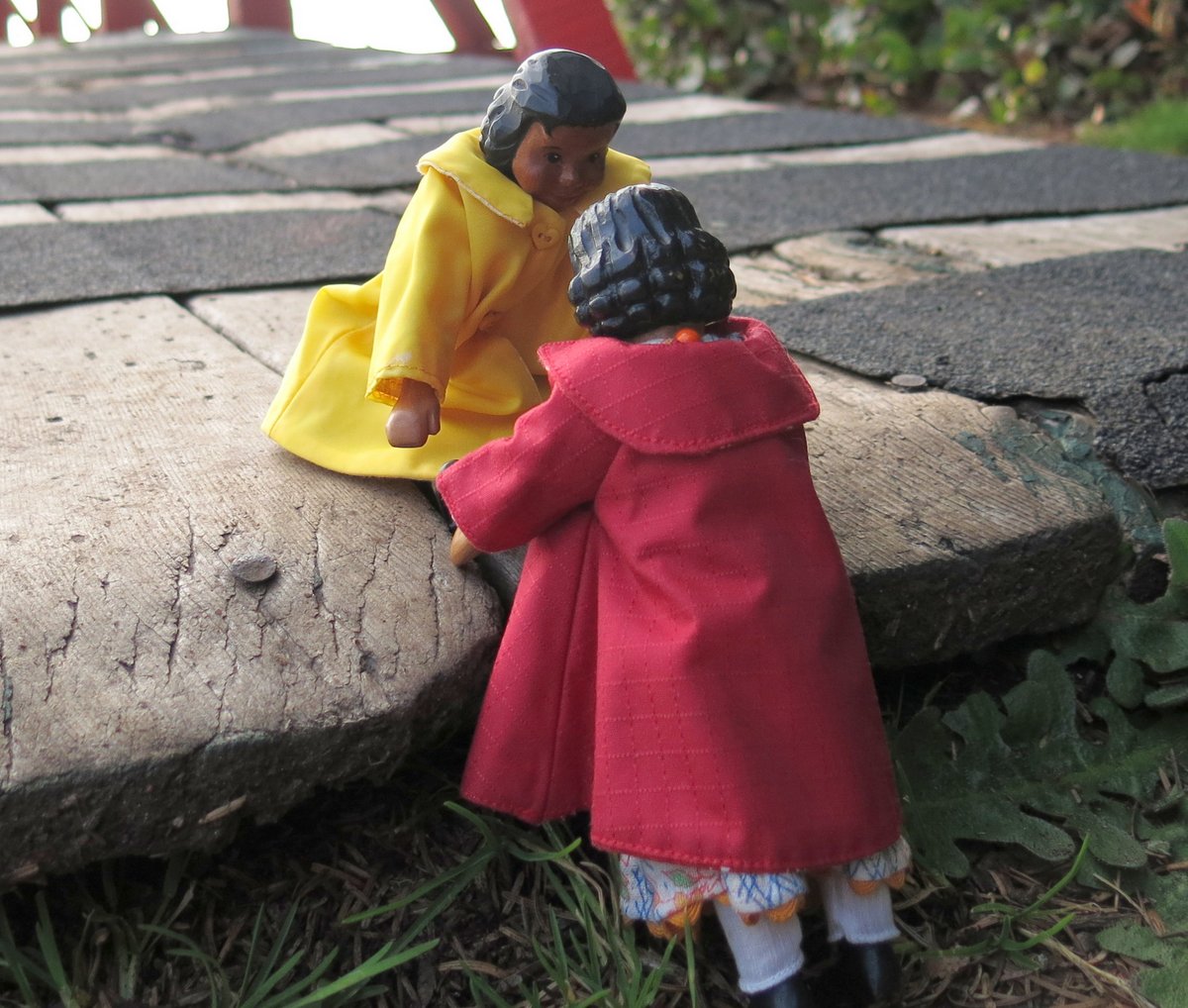 Ah, taking a jaunt with Hittys can be tiring. I’m with them, off to bed in ladybug gowns! Very pretty scenery by the way, but the red porch chair was a near second.