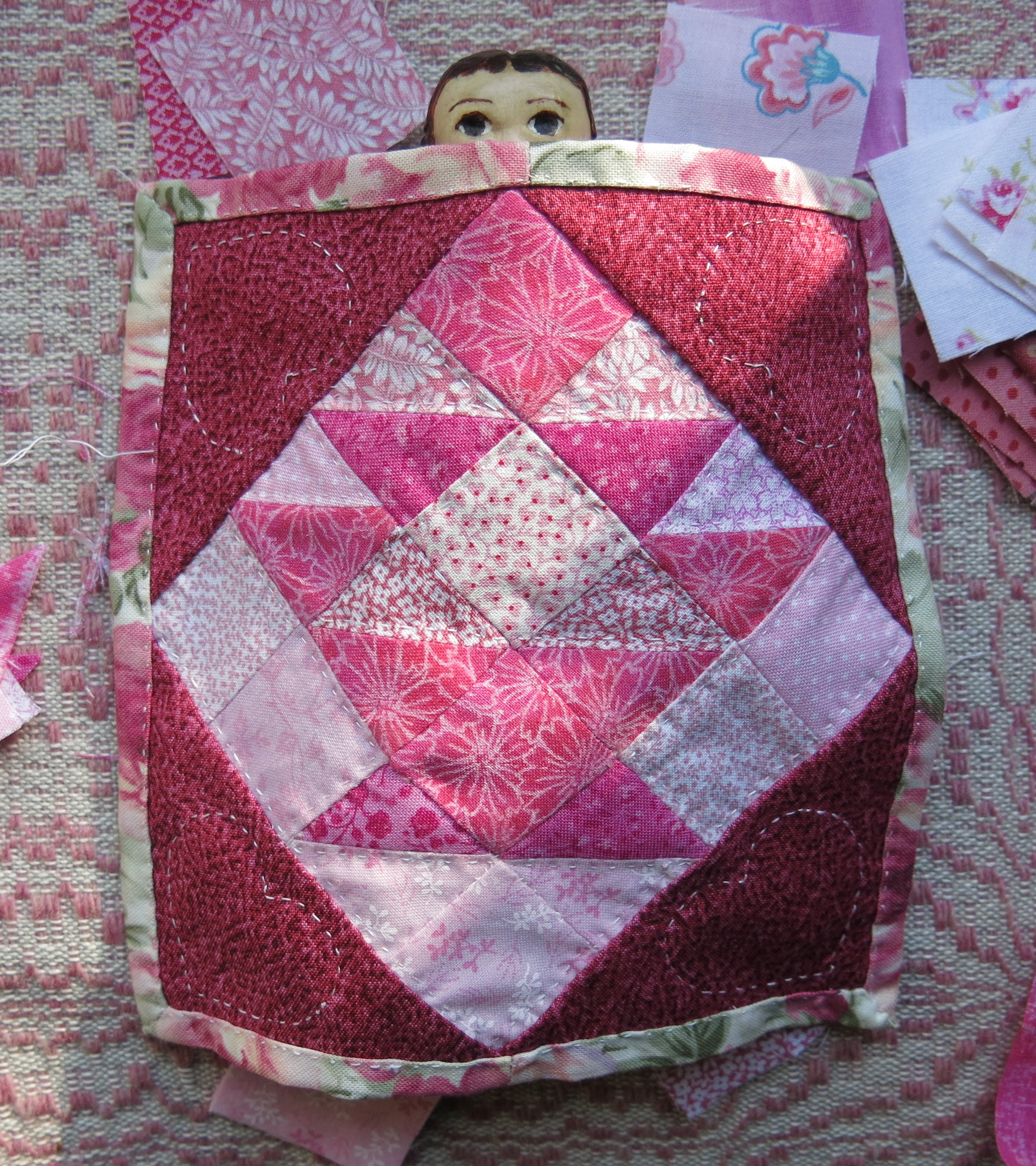 • Thank you – I was a bit tired when I made this one – I ended up having to take off the bottom three squares and re-stitch them right way up…and I think I could improve my corners, but it is wicked hard at this small scale.. I just keep stitching wee quilts for fun, so I don’t mind their imperfections too much…