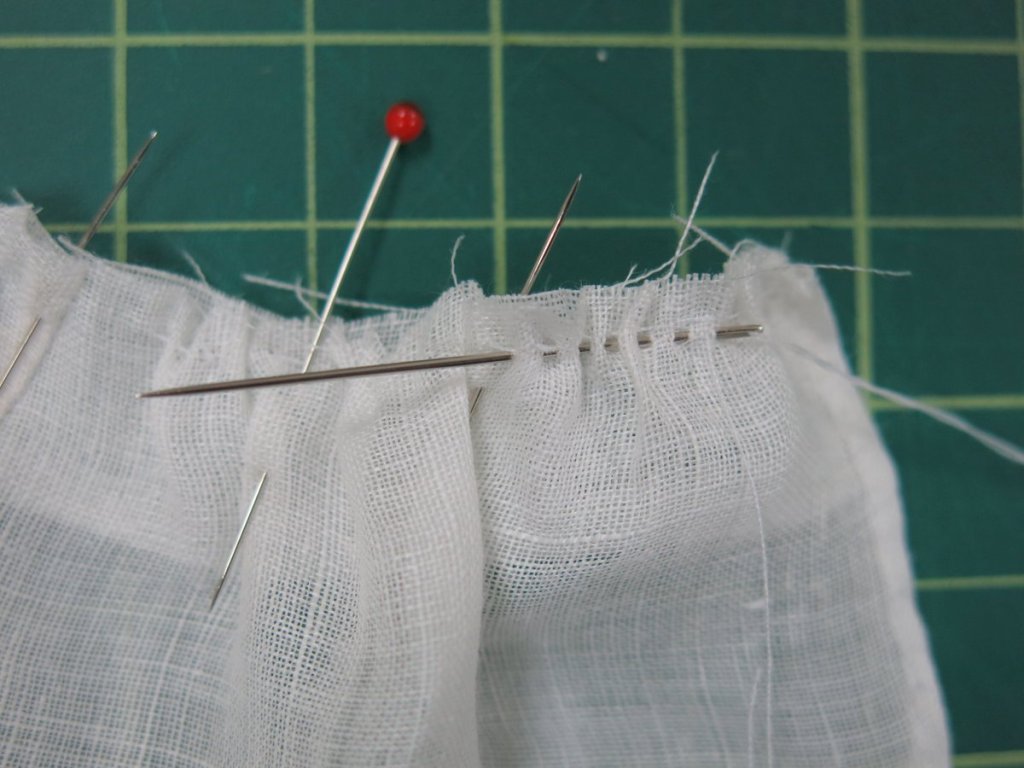 Stitch the waistband to the breeches. I have stitched the unfolded long edge to the inside of the waist seam.