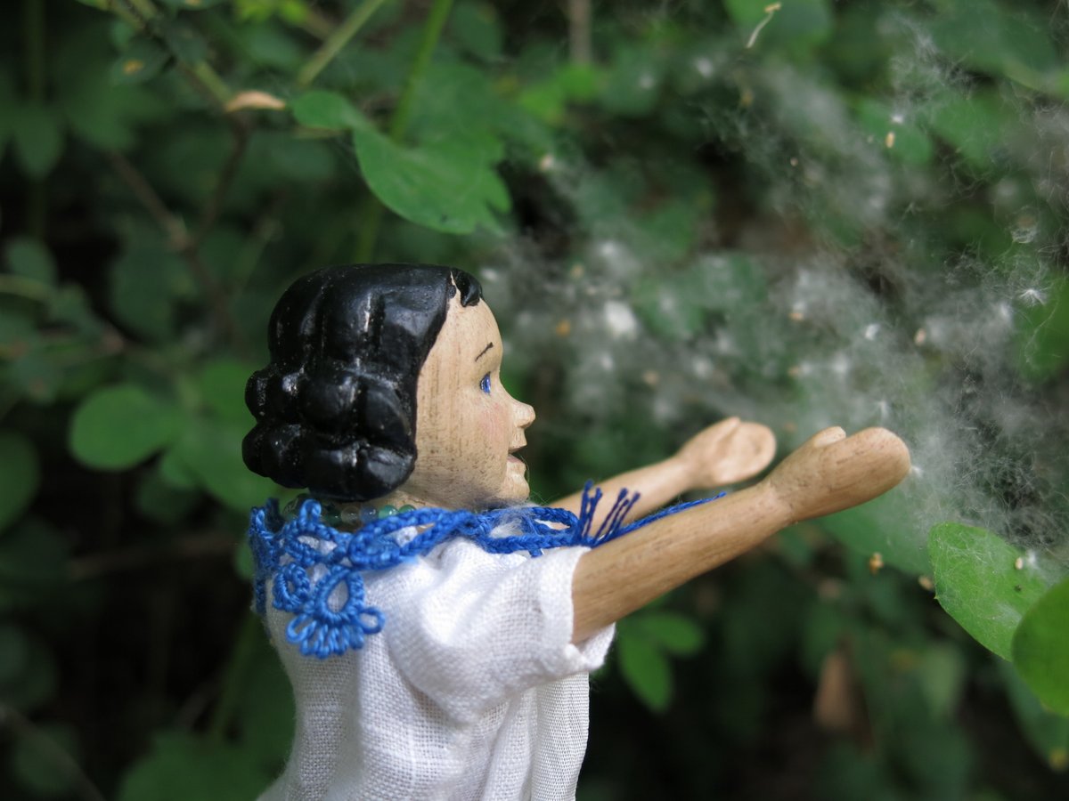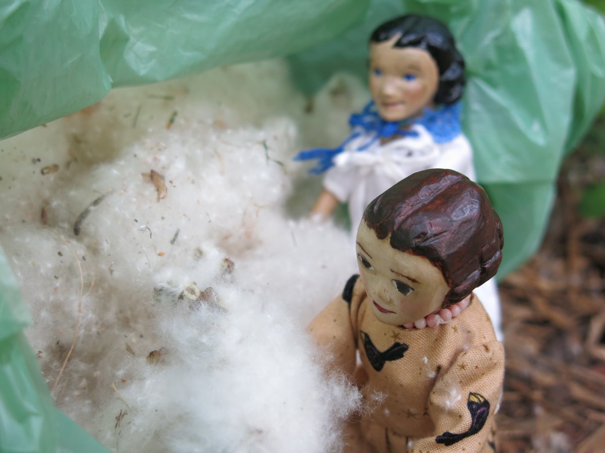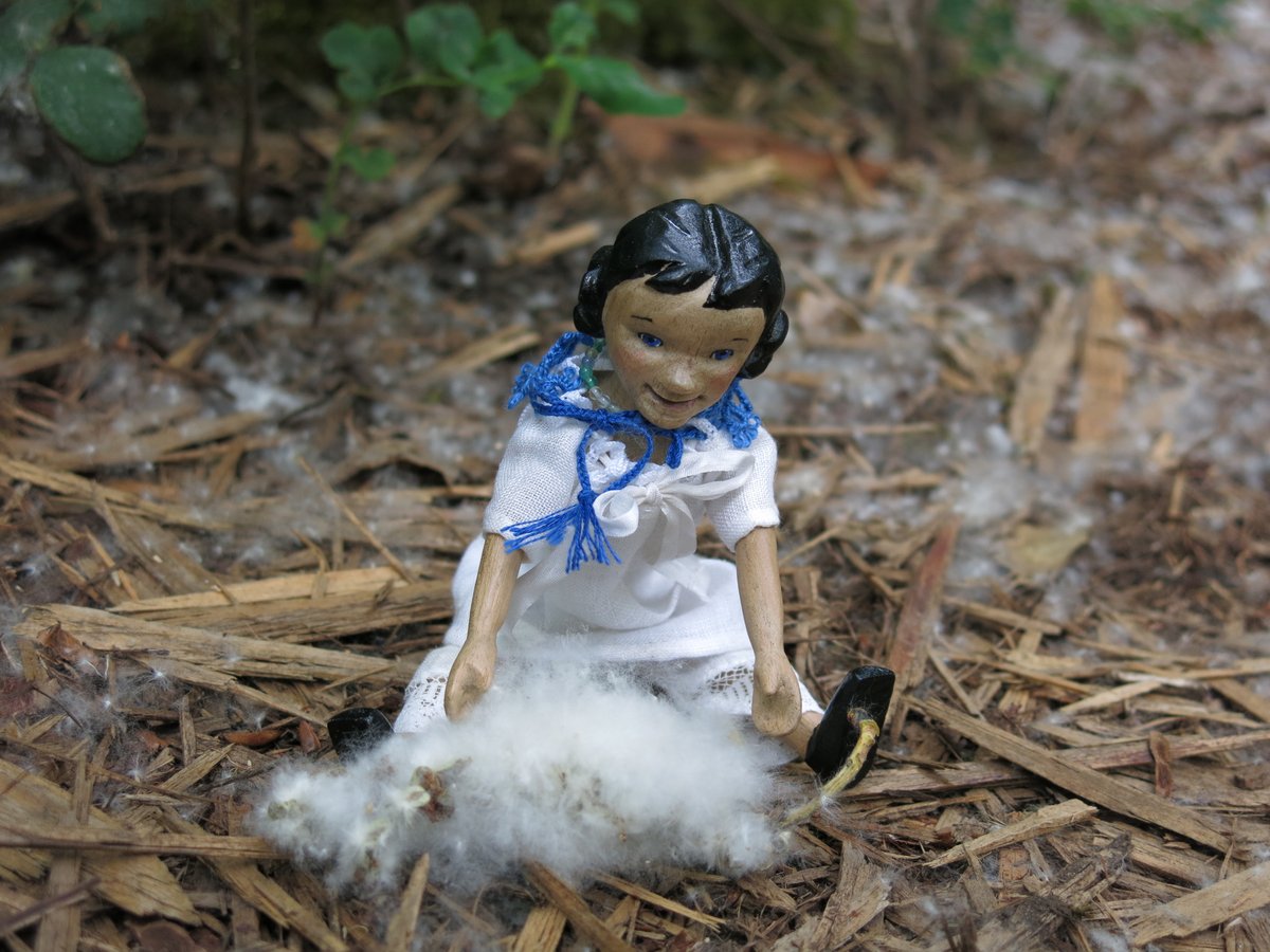 Constance and Tatty collected a big bag of cottonwood fluff…Constance thinks that since the fluff comes from the seed hairs like kapok and cotton, then it would make good stuffing for Hitty mattresses…