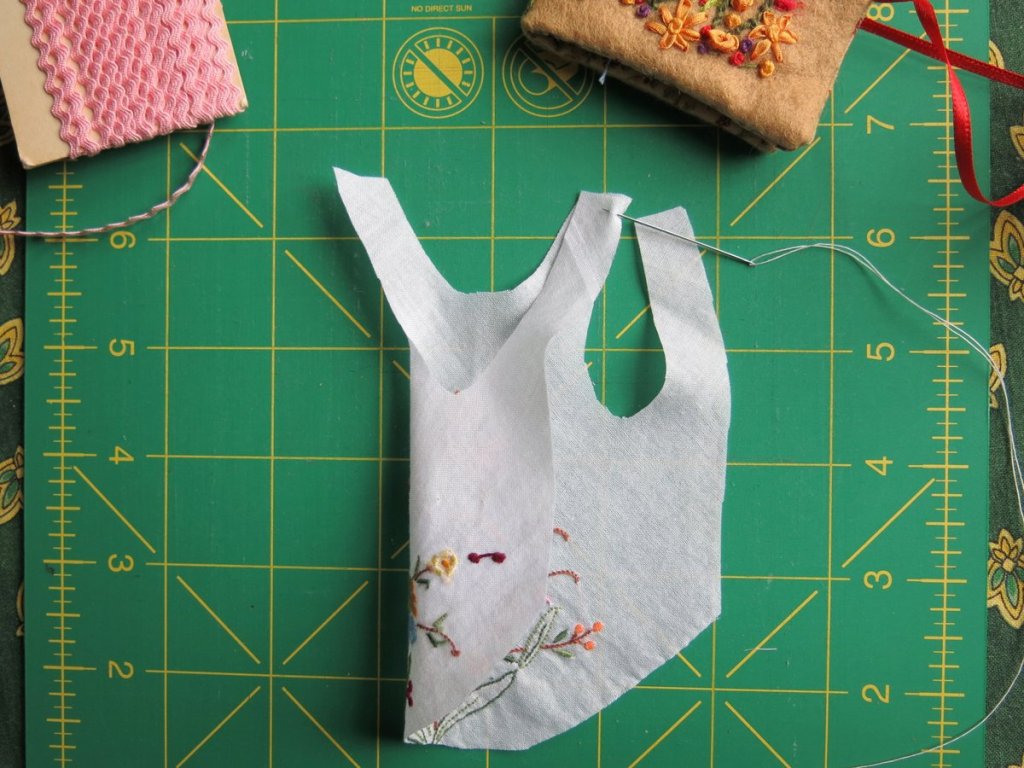 The shoulder seams are sewn first – match an outside (back) strap with the opposite inside (front) strap, and sew right sides together with an eighth-inch seam.