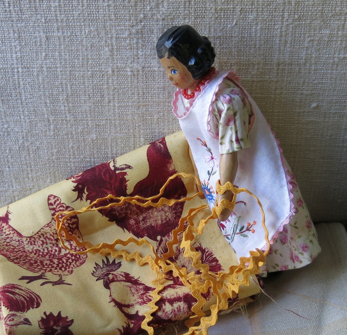 So, the answers are: the apron pattern works just as well on the straight grain and with big rickrack.  If anyone wants to try making it this way: I’d say, as always be careful not to stretch the cloth while sewing; after sewing and before ironing, snip the seam allowance up to the rickrack in the tight part of the curve at the neck and under the arms; and when ironing, use a small sandbag or clean wooden spoon instead of an ironing board, this will encourage the rickrack to lie flat around the curves, and it will end up sitting more nicely on Hitty.