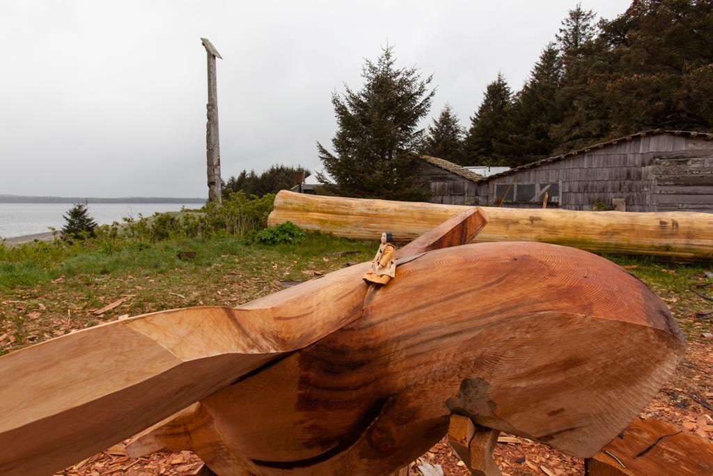 • Tansy went on this trip with the Quimper Hittys favourite photographer, so in this post all the photos are his…Just by chance her outfit blended in with the freshly carved cedar. Usually I send her to Haida Gwaii in jeans and a checked shirt with raingear, but she stowed away in the camera bag before I got a chance to discuss her wardrobe!