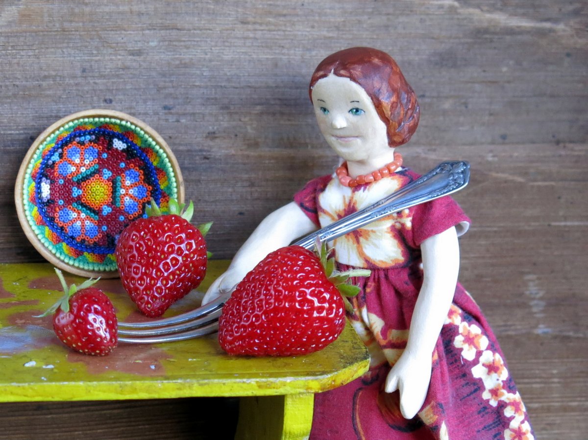 Inside the house, Hattie demonstrates the correct use of the berry fork, starting with the smallest of the three entire strawberries we picked today!