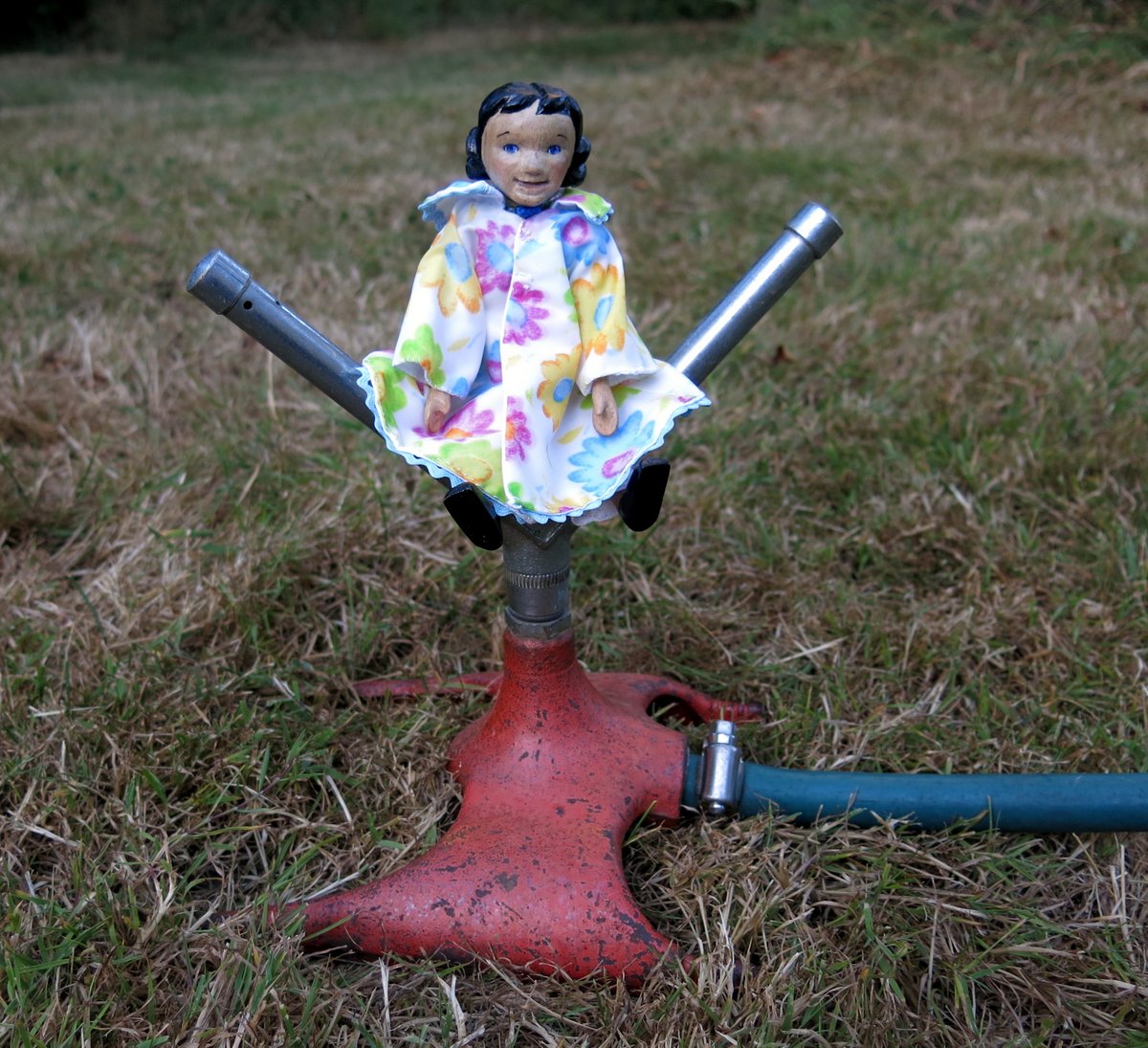 …but since there isn’t any rain in the forecast for at least a week, Tatty says she’ll have a go on our Buck Rogers Sprinkler.