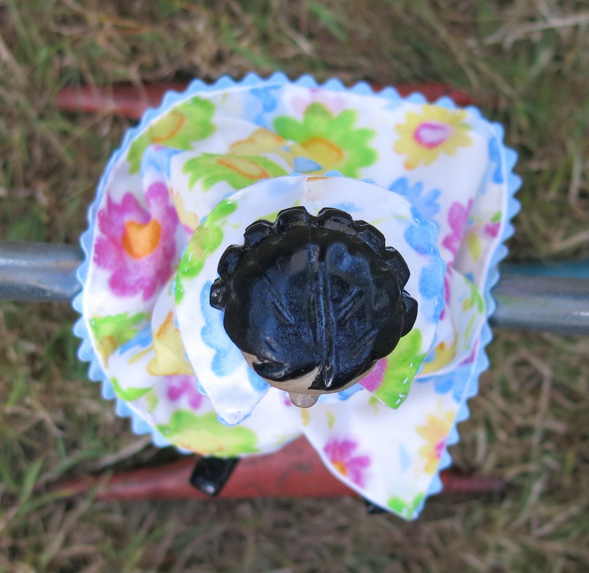 A few weeks ago, we had a tiny sprinkle of rain, and Tatty found a wrecked umbrella in our front yard.  She nobly agreed with the human that it could be sacrificed to make a pretty fine Hitty raincoat…Click raincoat pattern and method to link to the Quimper Hitty post about making raincoats.