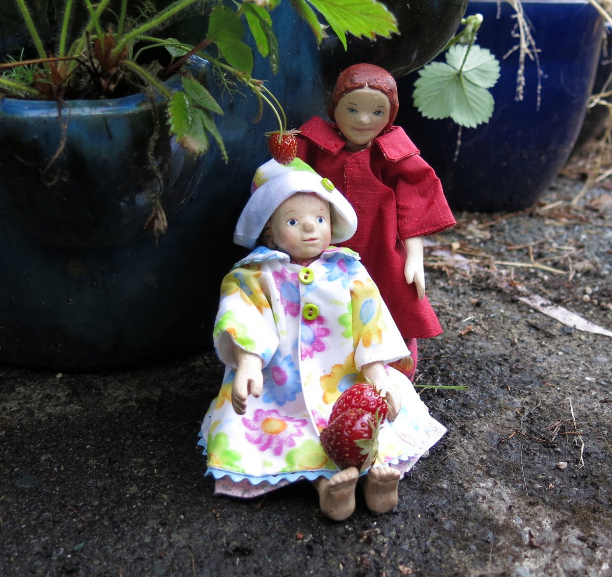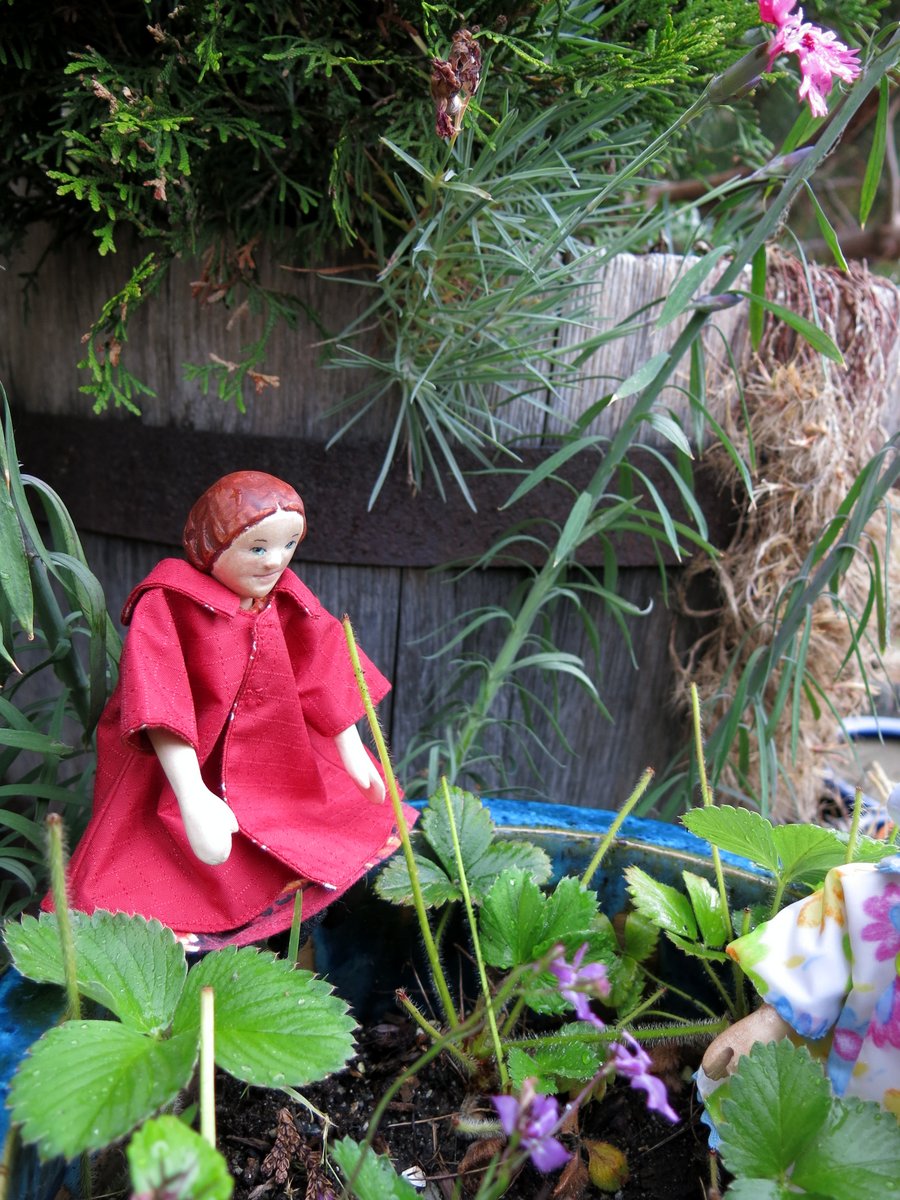 Rain at last!  Hattie had promised to bring Dulcie Berry-picking so they donned their raincoats and ventured outside.  Oh drat!  The plants at the top of the planter were cropped short during the night by ravening deer…
