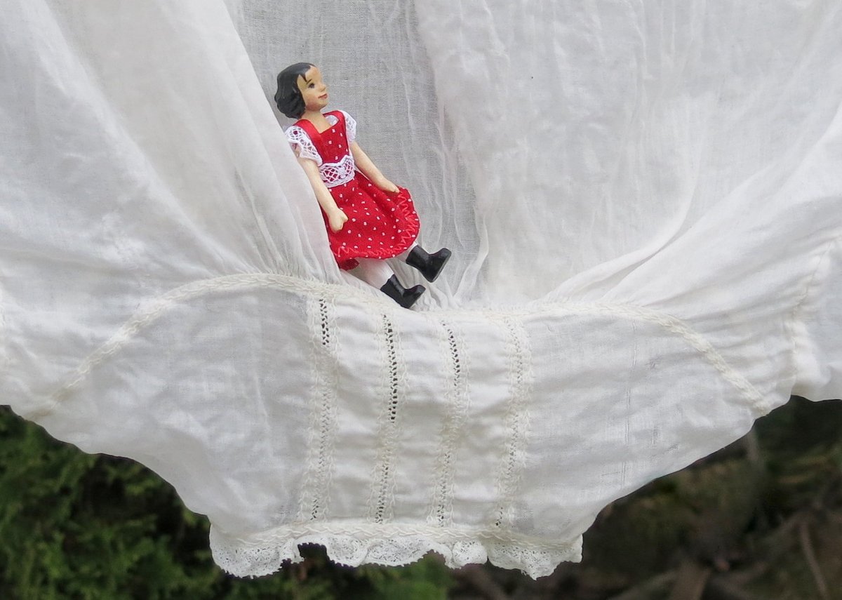 The linens were wafted here by a zephyr in January, it has taken me this long to get them washed…they are in various states of repair and age-related decrepitation…but are soft and pretty and a very nice weight for doll clothes…so their destiny might include transformation into smalls for small dolls.