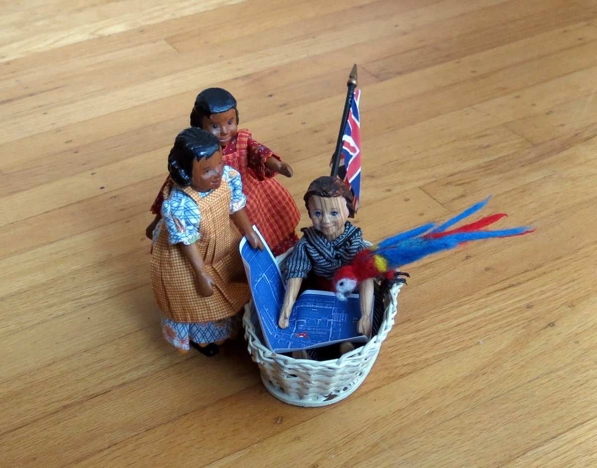 I am also, once again, impressed and delighted by the animation and emotion you are capable of conveying with raw materials of such stiff wooden simplicity – I swear I can hear what’s being said in the first photo – and that parrot is listening in, eyes and ears on the alert; in the second photo that parrot is so intent on the accurate navigation of this coracle-like craft: Graïnne is totally focussed on the goal, while the block-twins are full of advice and interjection – I can’t quite make out what they’re saying, they are possibly keeping it secret? But I am all agog for whether they manage to accompany Graïnne, or follow her – or whether they are going to be sitting around excitedly awaiting her return with the bounty … suspense!