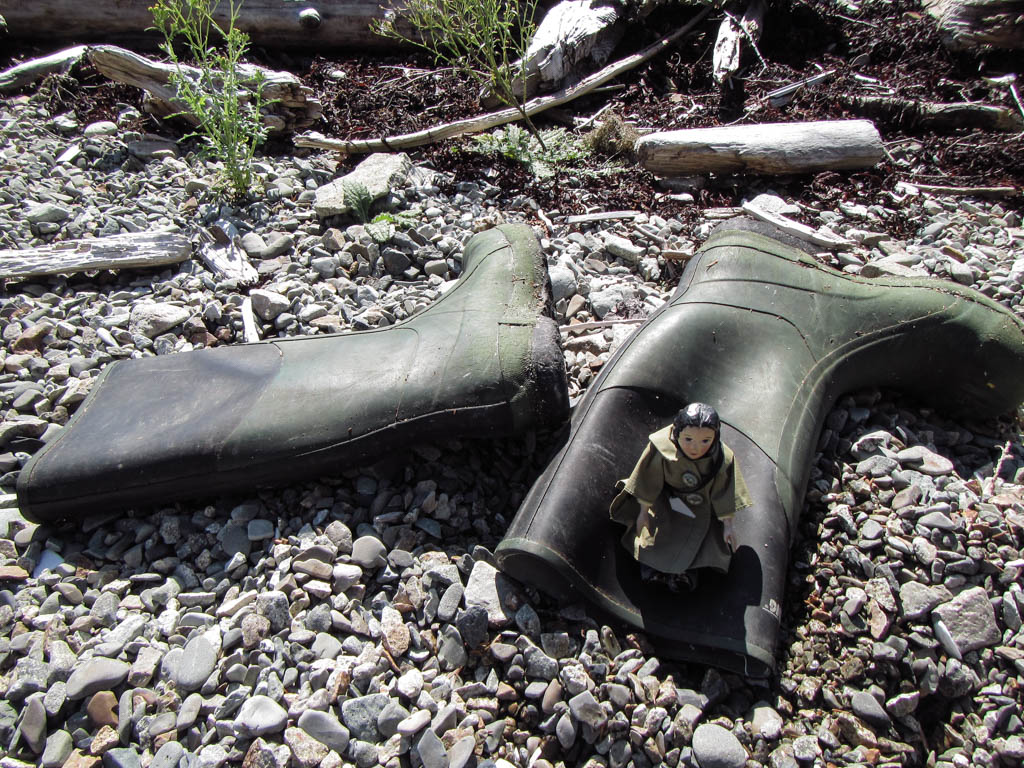 Tansy has just spent a summer among archaeologists. During the recent stint on Haida Gwaii, Tansy and her companions clambered around on the foreshore looking for evidence of use by ancient peoples! When the crew stopped for lunch, human gum boots came off but Tansy continued looking for interesting things on the beach.