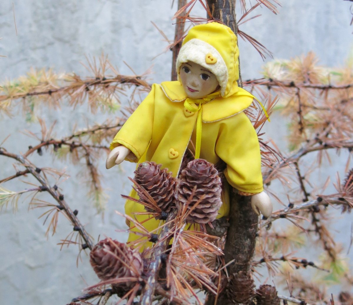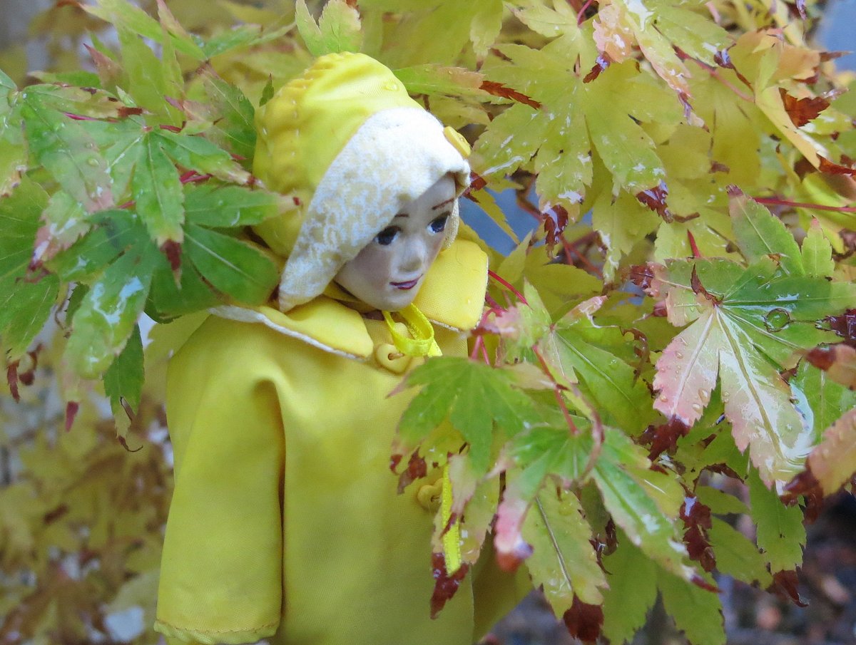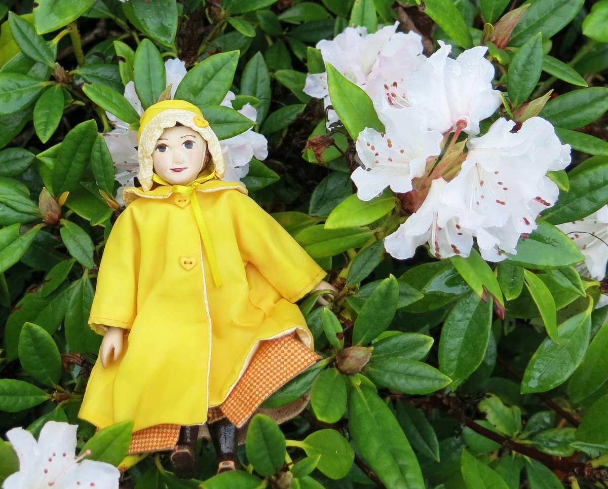 can’t believe you rhodo is flowering.Constance looks lovely in her cheery raincoat.