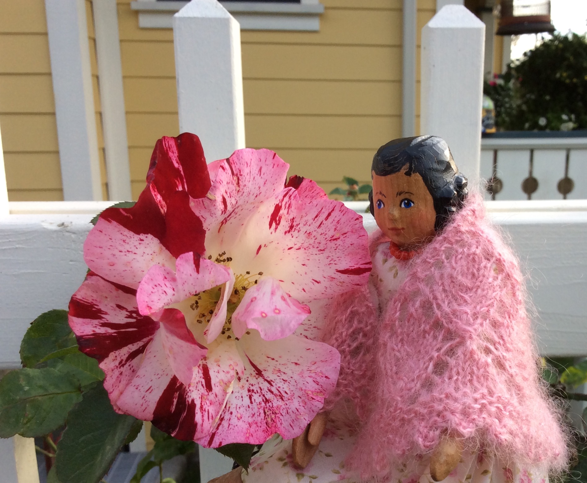 Rose looks adorable in her pink rose dress and pink shawl–just perfect for enjoying the last blooming roses of the season!