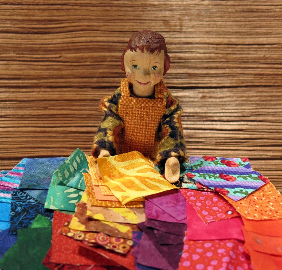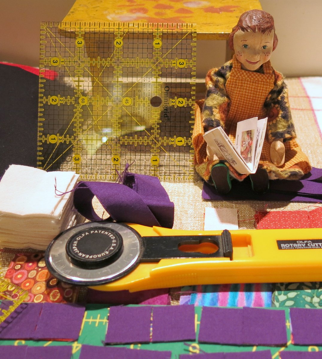 The quilt will be for Carrot Soup, but first she has to practice patience since the Quimper Hitty human is awfully busy this week!  Luckily she is happy to watch the (very slow) progress while reading a classic fairy tale book! This is the season for old tales and warm quilts I think…