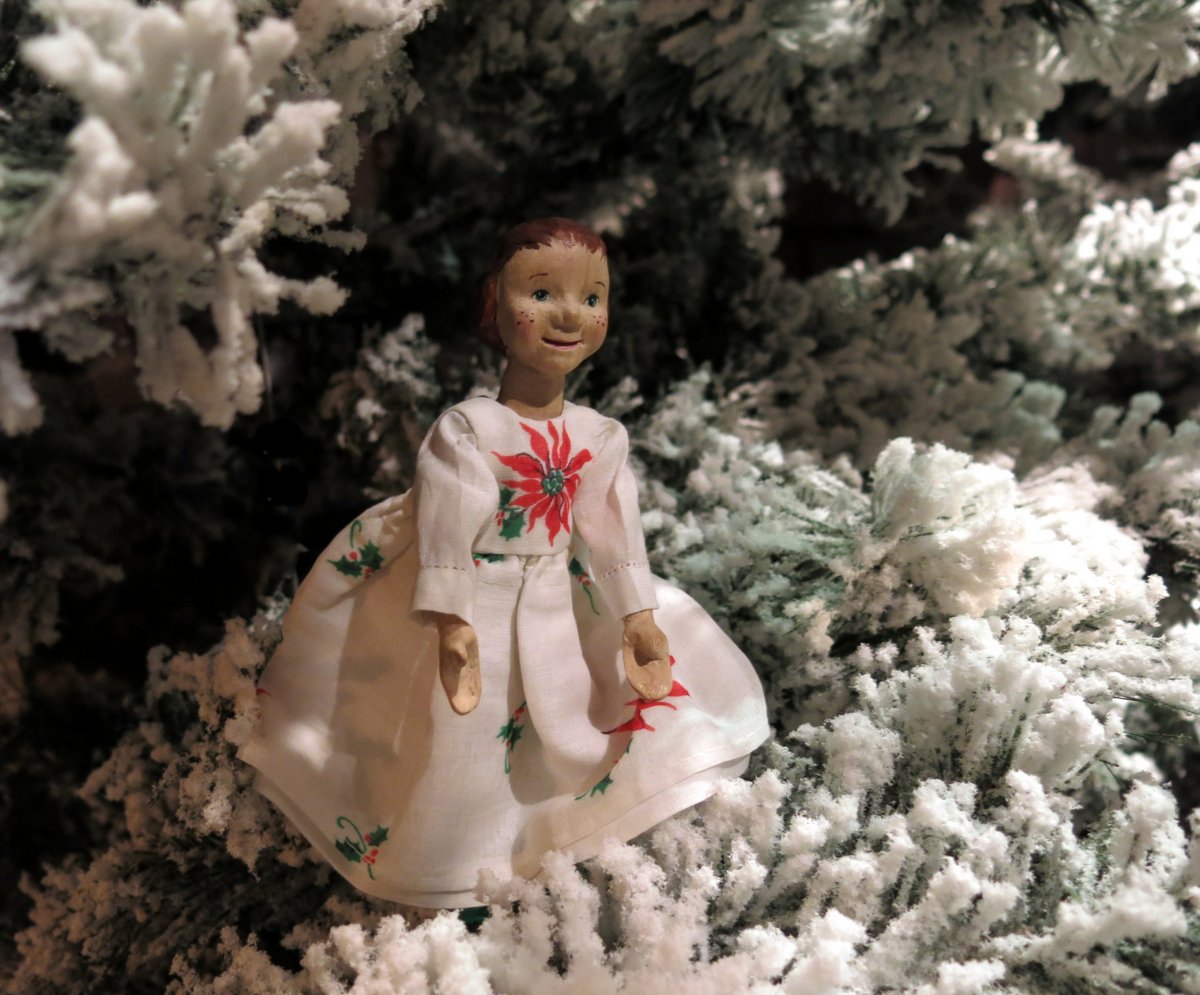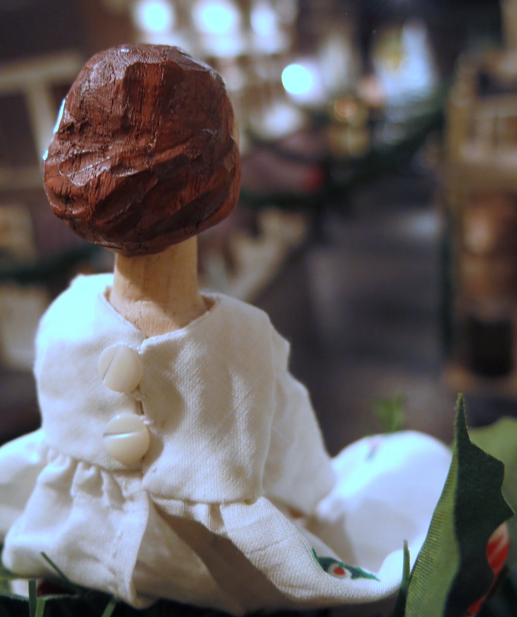 Carrot Soup with her pretty bells fits right in with the gingerbread and pine cone lintel decoration.