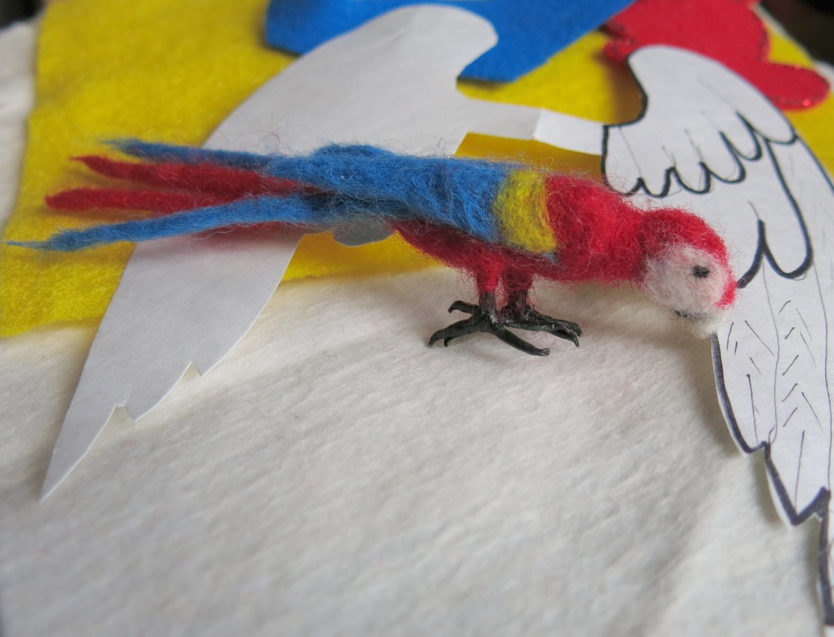 Also fortunately for us, we have some raw materials in our scrap bag, in the felt section…Parrot was concerned at the flat aspect of the felt, and had some suggestions about making the wings a little more real looking…