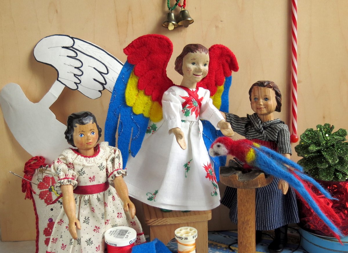 Thanks to the numerous suggestions by people here on the blog, and out in the Quimper Hitty Human’s real life, Carrot Soup was elected Christmas Angel this year! This is especially noteworthy as up to now we have had a Star at the top of our tree, not an angel. Carrot Soup is excited by the honour! Her little dress will do, but Christmas Rose and Gráinne decided to help her assemble some wings.