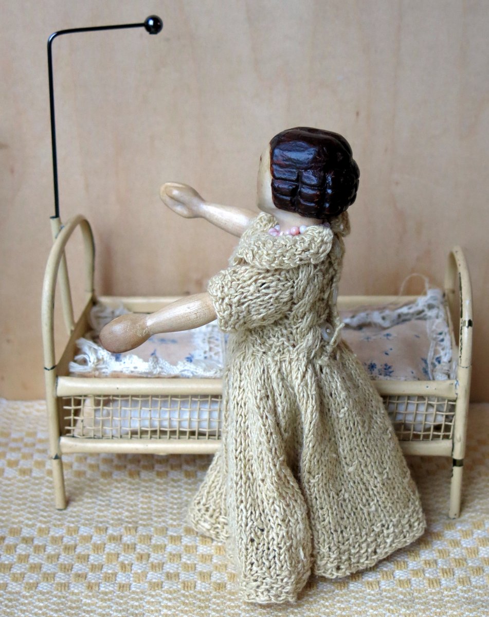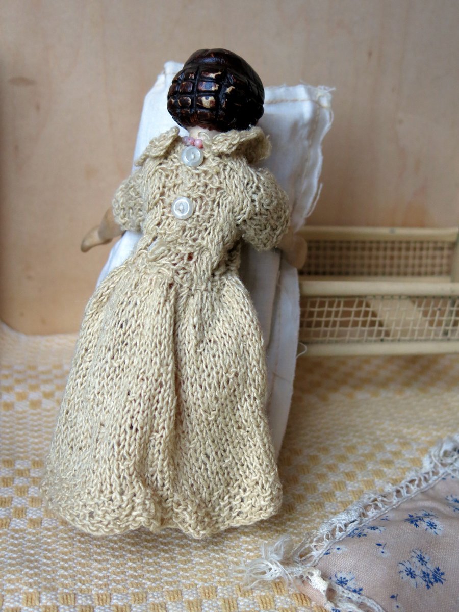 Perhaps wee Pip could keep the bed warm until it’s new person emerges from block state? It is an adorable bed! I love Constance’s knitted dress. It looks like silk… how elegant!