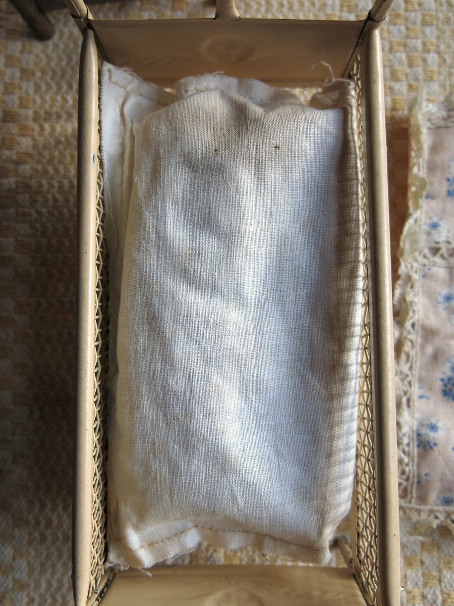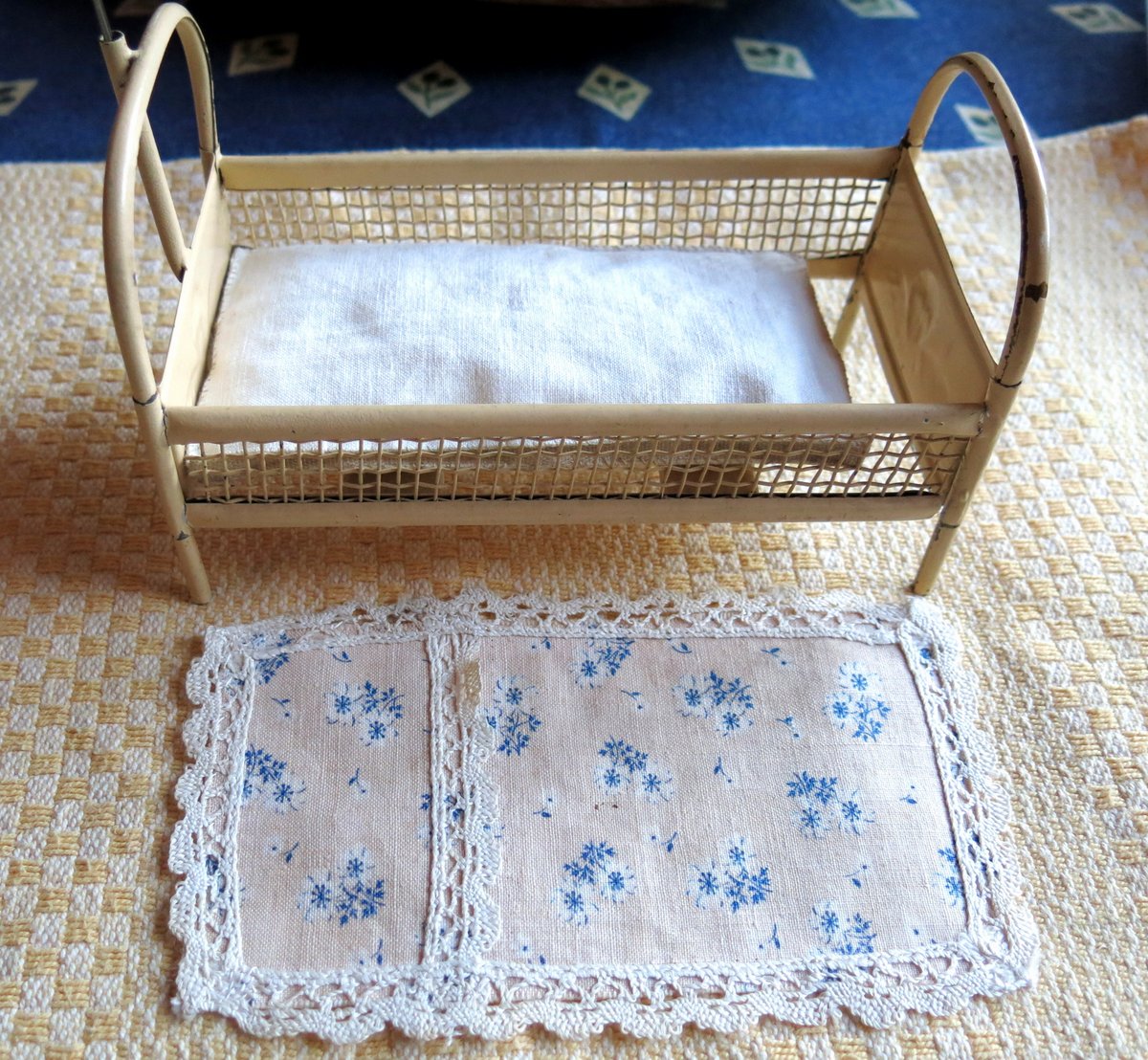 A little antique tin dolly bed from my friend the Dollhouse Lady came with an old mattress and coverlet. I decided to refurbish the bed so it could be used by the Quimper Hittys. Usually I retain the original materials without changing their essence, except for possibly wet-cleaning. This time I kept the original mattress materials, washed them (Constance says thank you) and altered them slightly.