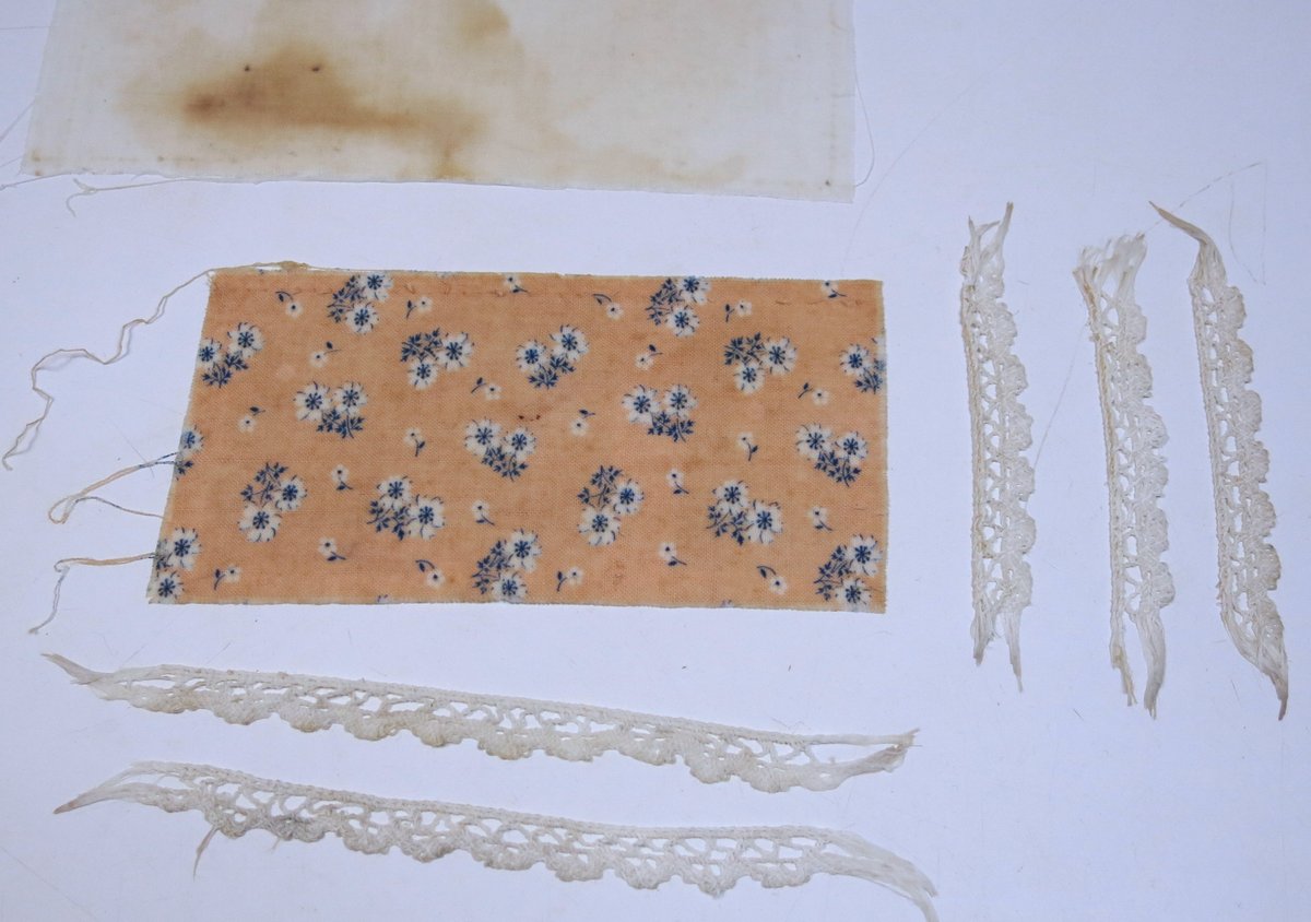 The Quimper Hitty’s favourite photographer helped me make a canopy rod out of an old car antenna, and then I scrounged in my stash for a bit of fabric. This little rectangle with Belgian lace edging looked perfect.