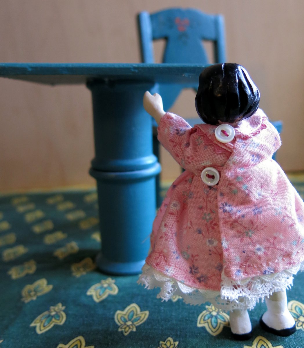 now I have a better idea of how very small the littlest Hitty really is, her pink dress is perfect.
