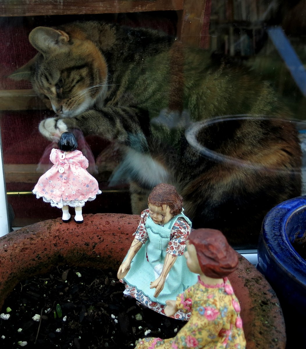In between rainshowers some of the Quimper Hittys took a little wander in the spring bulb garden pots – Gillyflower wondered if the cat wanted to play with her!